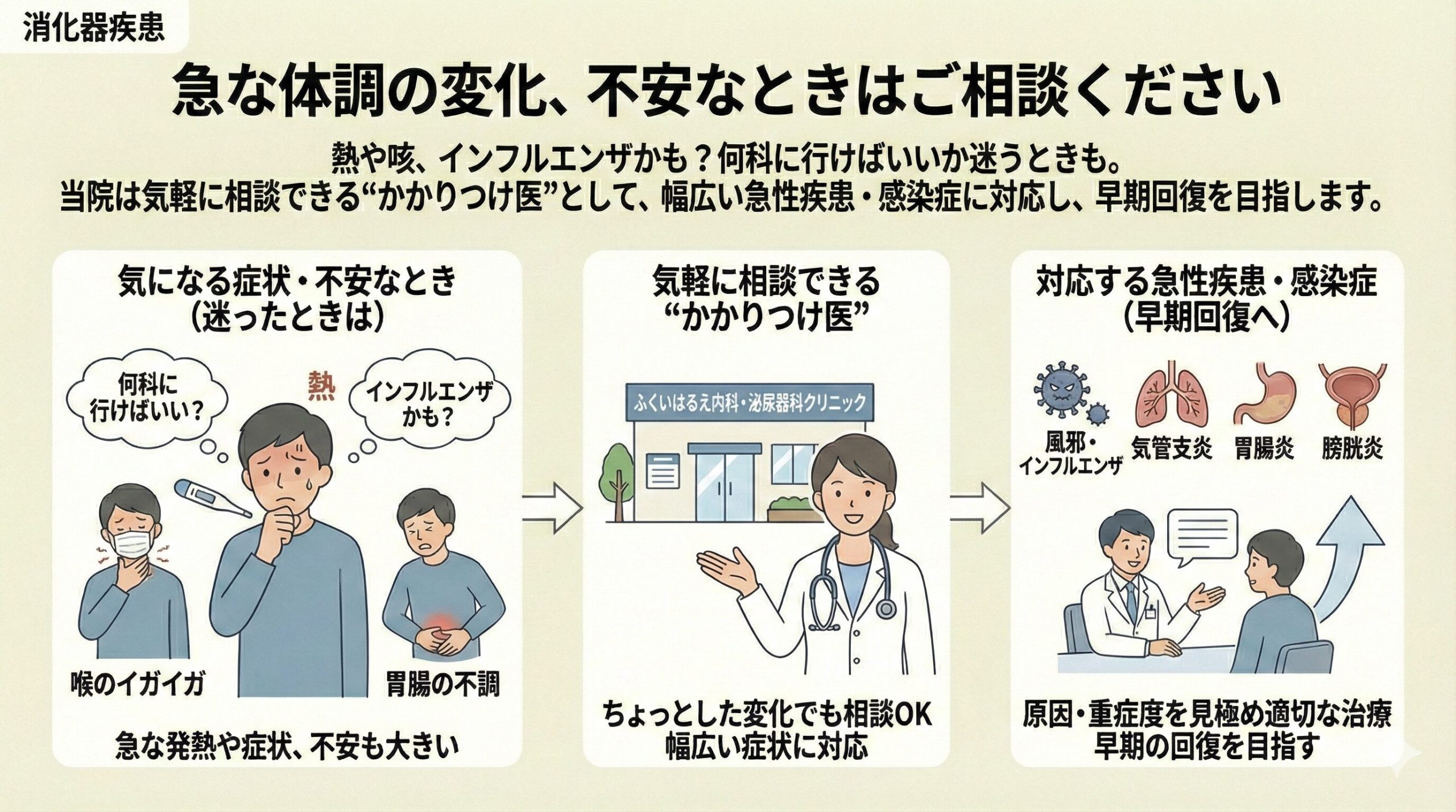 ふくいはるえ内科・泌尿器科クリニックでは、風邪やインフルエンザ、気管支炎、胃腸炎、膀胱炎など、急性疾患・感染症の診療を行っています。症状の原因や重症度を見極め、必要な治療を適切にご案内し、早期の回復を目指します。