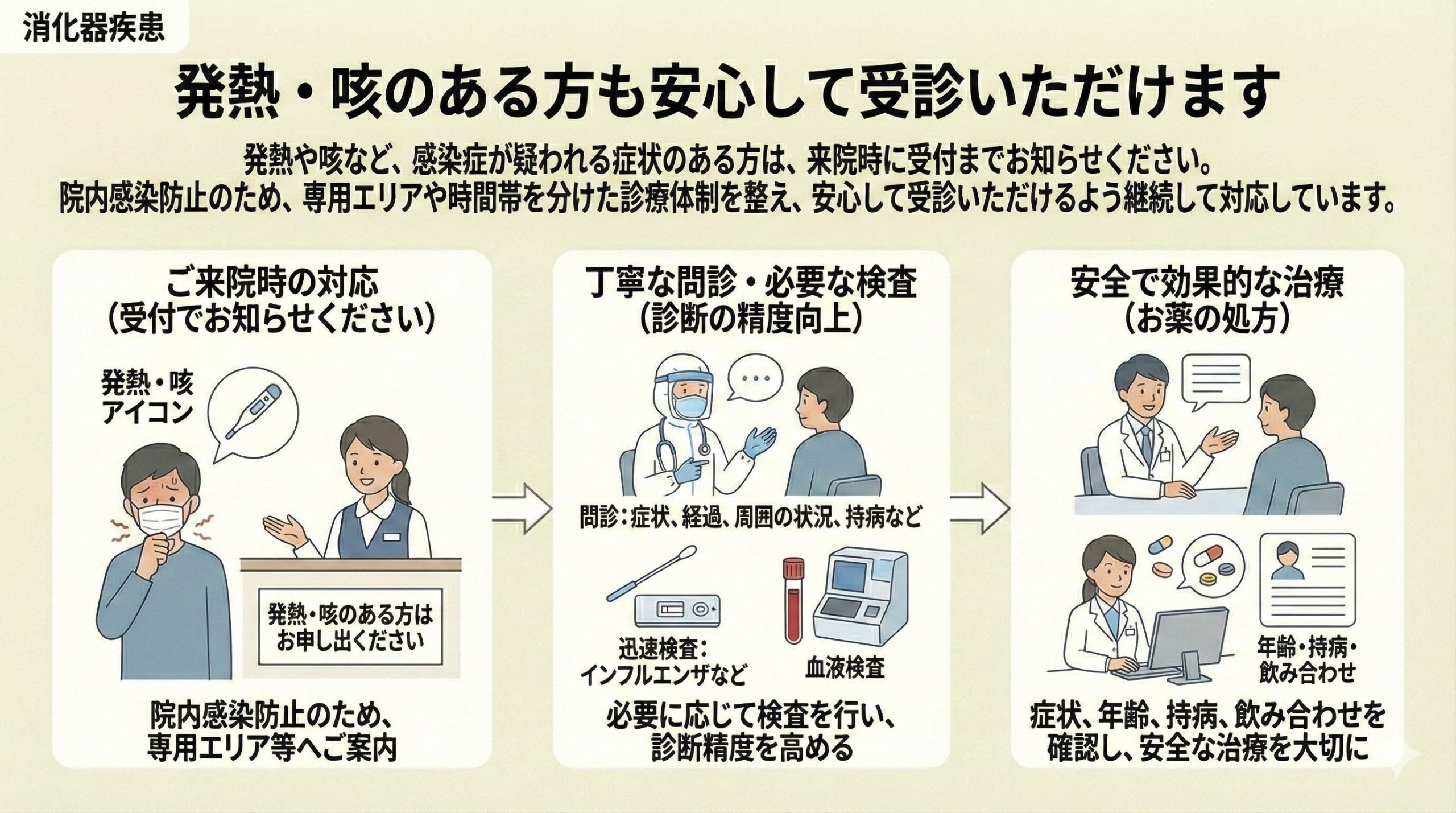 発熱や咳など、感染症が疑われる症状のある方は、来院時に受付までお知らせください。当院では、院内での感染拡大を防ぐため、発熱外来専用エリアへのご案内や、他の患者さんと時間帯を分けた診療体制を整えています。