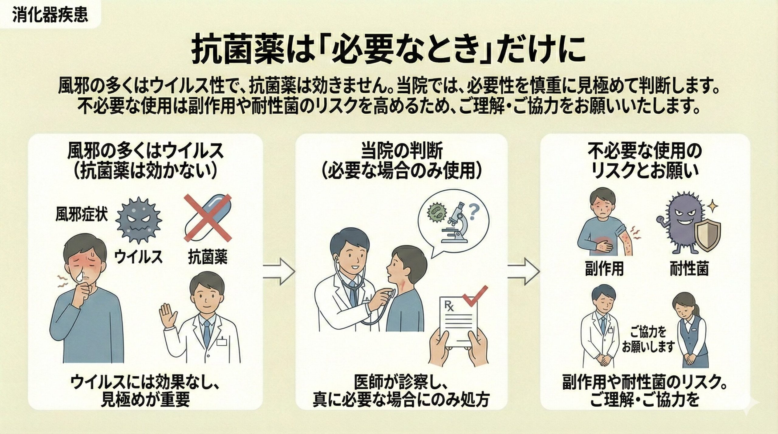 「とりあえず抗生物質を出してほしい」とおっしゃる方もいらっしゃいますが、不必要な抗菌薬の使用は副作用や耐性菌のリスクを高める原因にもなります。ご理解・ご協力をお願いいたします。