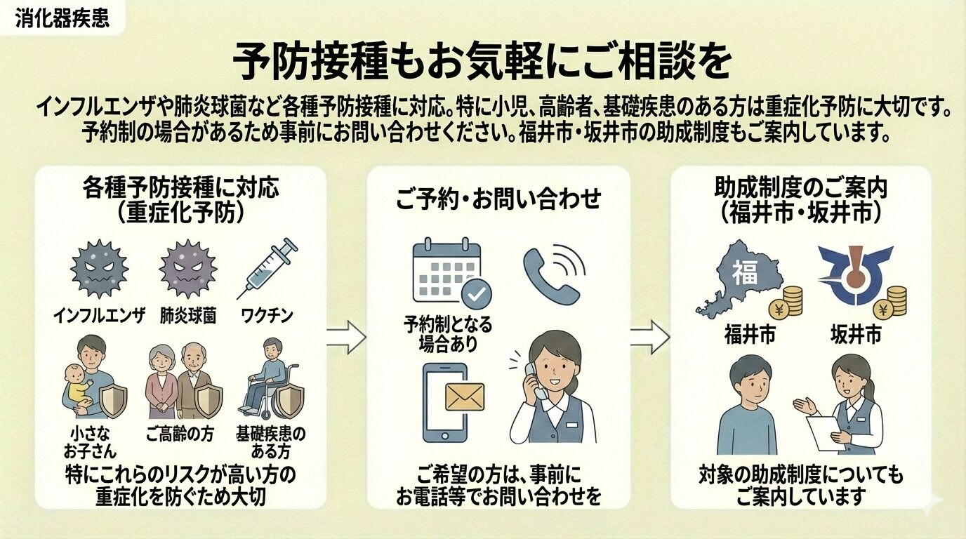インフルエンザワクチンや肺炎球菌ワクチンなど、各種予防接種にも対応しています。特に小さなお子さんやご高齢の方、基礎疾患のある方は、感染症の重症化を防ぐためにも予防接種が大切です。