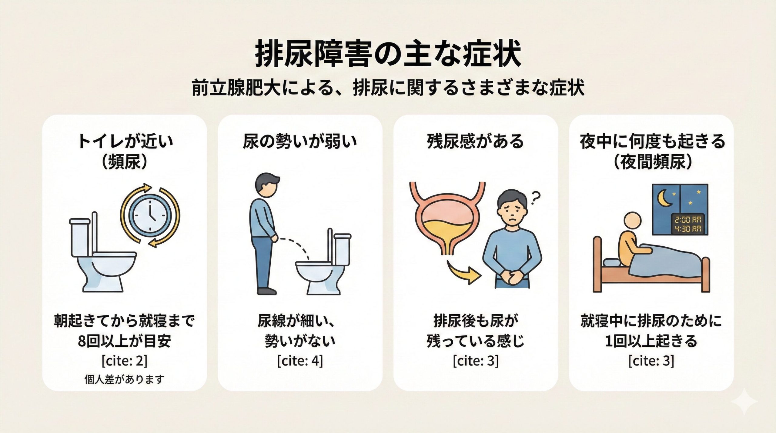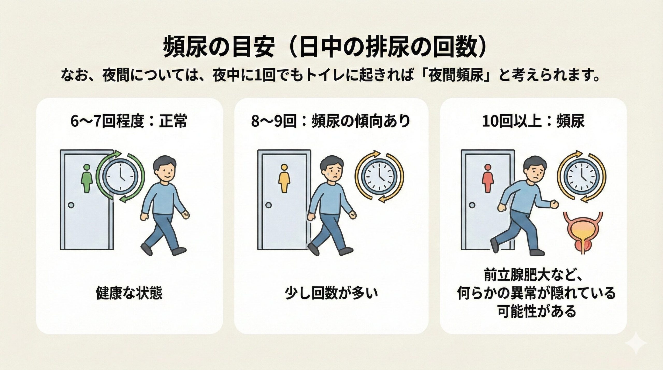 なお、夜間については、夜中に1回でもトイレに起きれば「夜間頻尿」と考えられます。