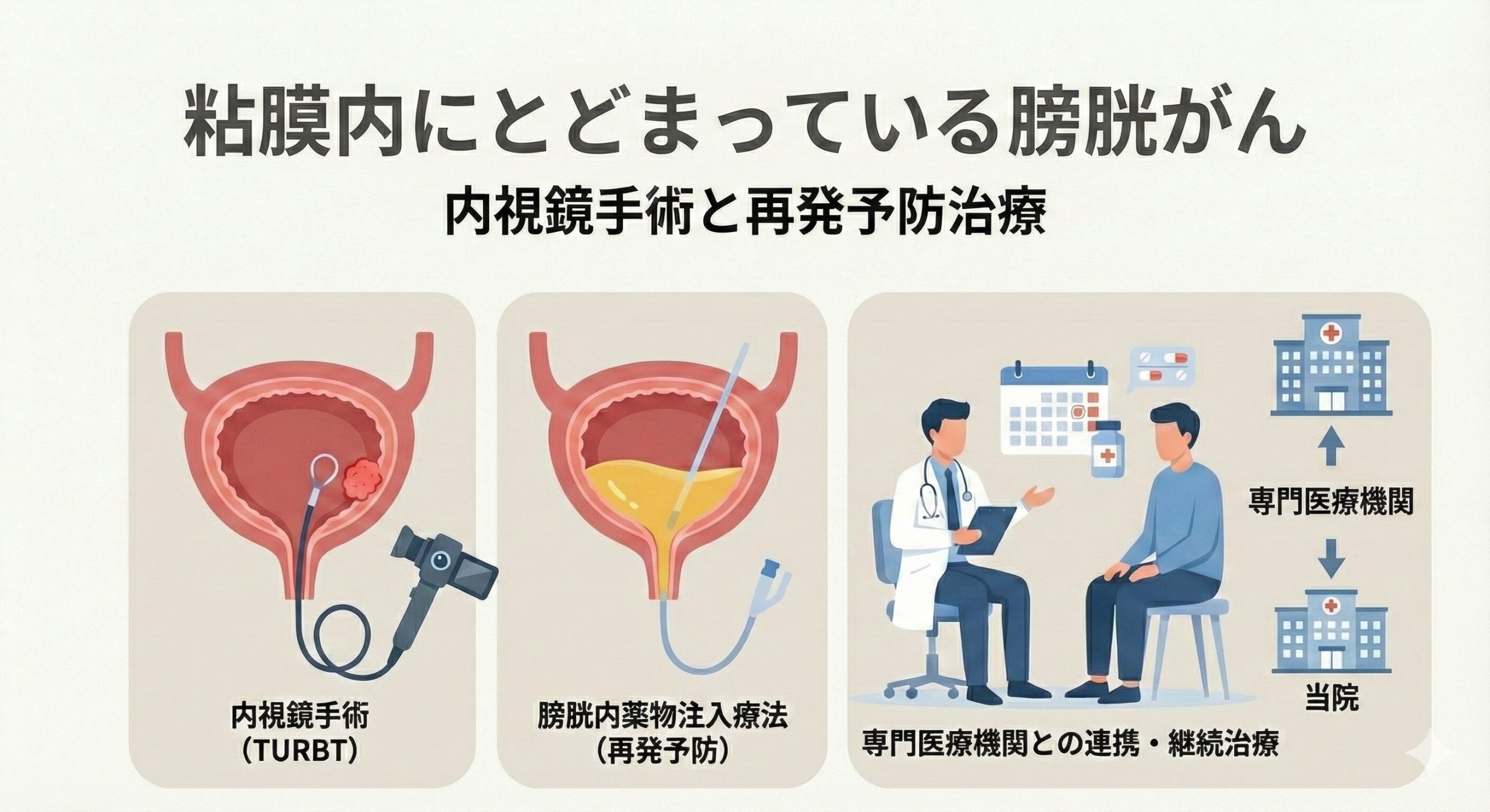がんが膀胱の壁の浅い層までにとどまっている場合には、比較的体への負担が少ない内視鏡手術で、がんを取り除くことができます。手術のあとには、がんの再発を防ぐ目的で、薬を膀胱の中に入れる治療が追加されることがあります。薬には抗がん剤やBCGワクチンを応用したものが用いられ、一定期間にわたって繰り返し行うケースがあります。当院では、専門医療機関で手術を受けた患者さんに対して、この薬による再発予防治療を引き続き実施しています。