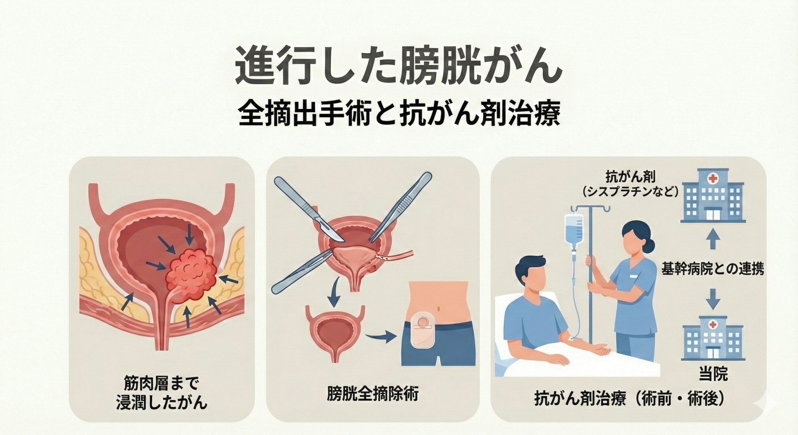 がんが膀胱の筋肉の層にまで広がっている場合には、膀胱を全て摘出する手術や、シスプラチンという薬剤を中心とした抗がん剤治療が必要となります。また、手術の前に抗がん剤治療を行ってがんを小さくしたり勢いを弱めることで、より効果的な手術につなげることもあります。当院では、基幹病院と連携してこれらの治療を行い、治療後は経過観察や補助療法を当院で継続します。