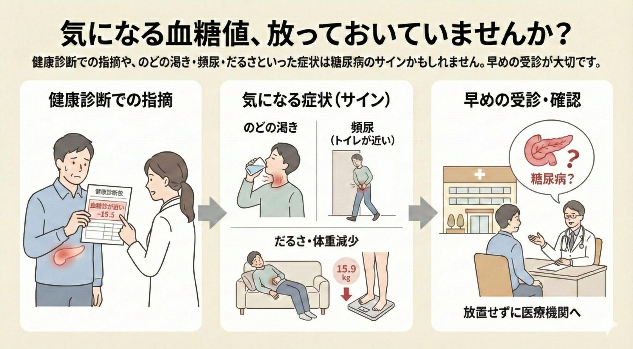 そんな症状がある方は、糖尿病の可能性があるかもしれません。初期にははっきりした自覚症状がないことも多く、知らないうちに進行しているケースも。気になるサインに気づいたら、早めに受診して確認しておくことが大切です。