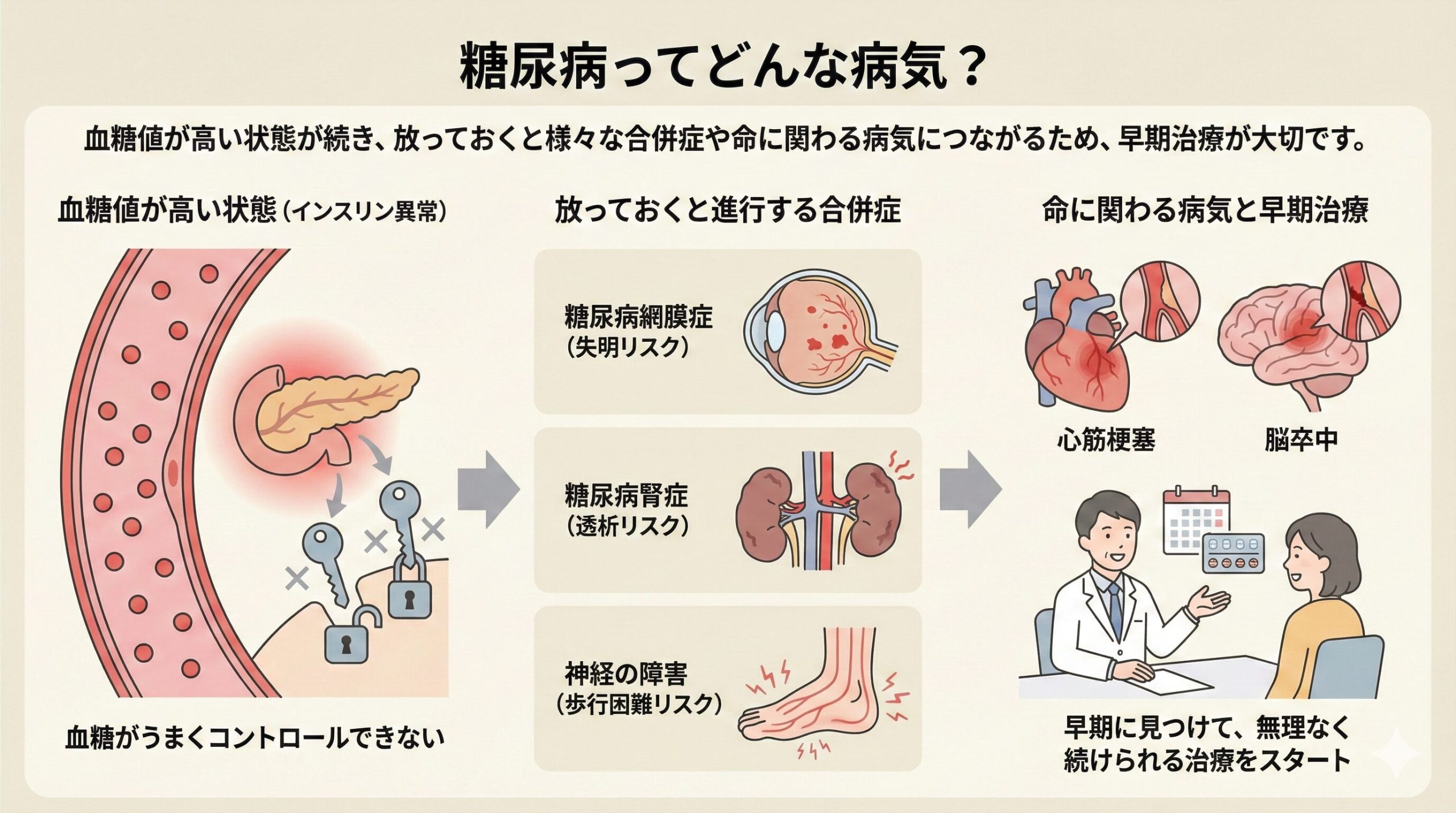 糖尿病は、放っておくとさまざまな合併症が出てくる病気です。だからこそ、定期的な検査で早めに変化に気づくことが重要です。