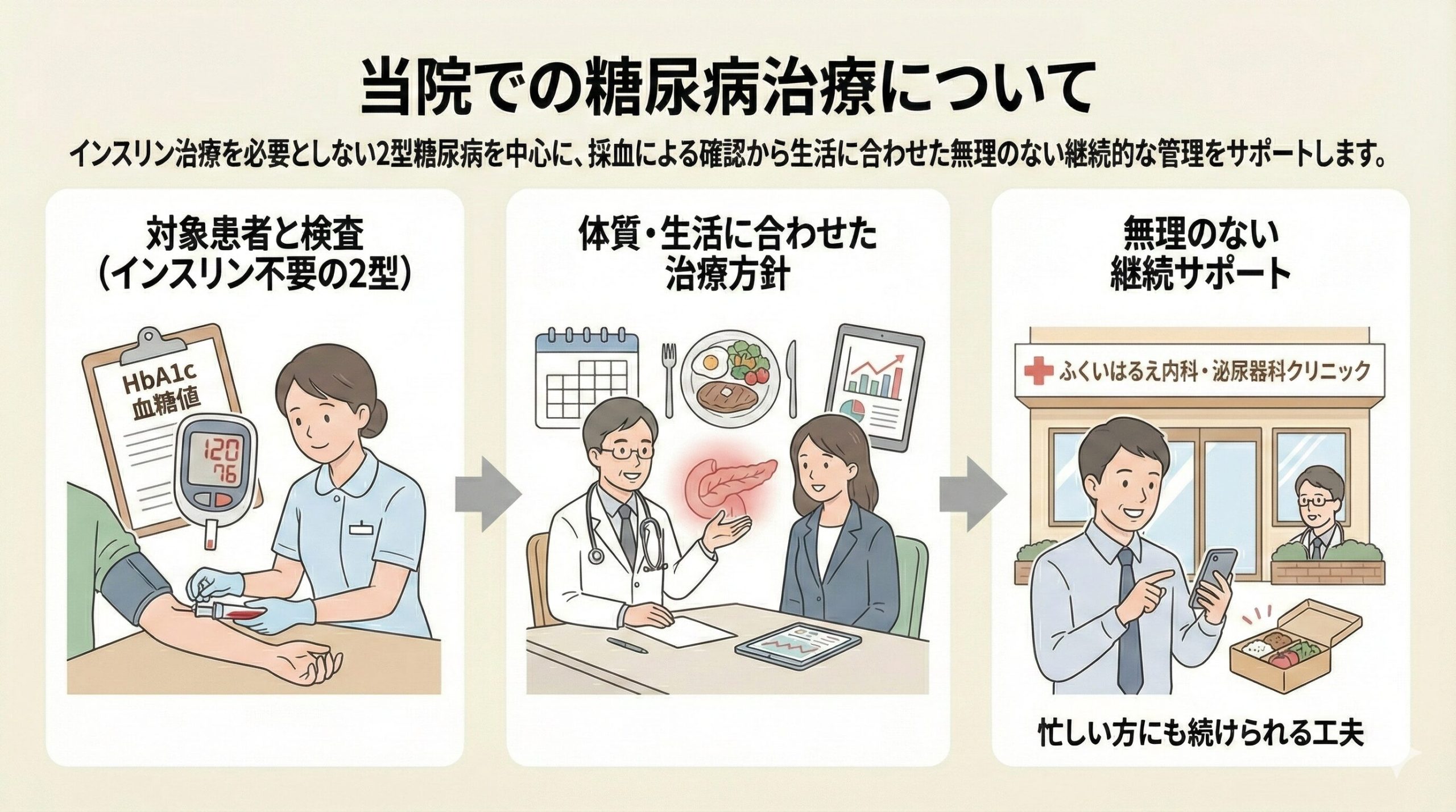 ふくいはるえ内科・泌尿器科クリニックでは、インスリン治療を必要としない2型糖尿病の患者さんを中心に、日々の血糖管理をサポートしています。
