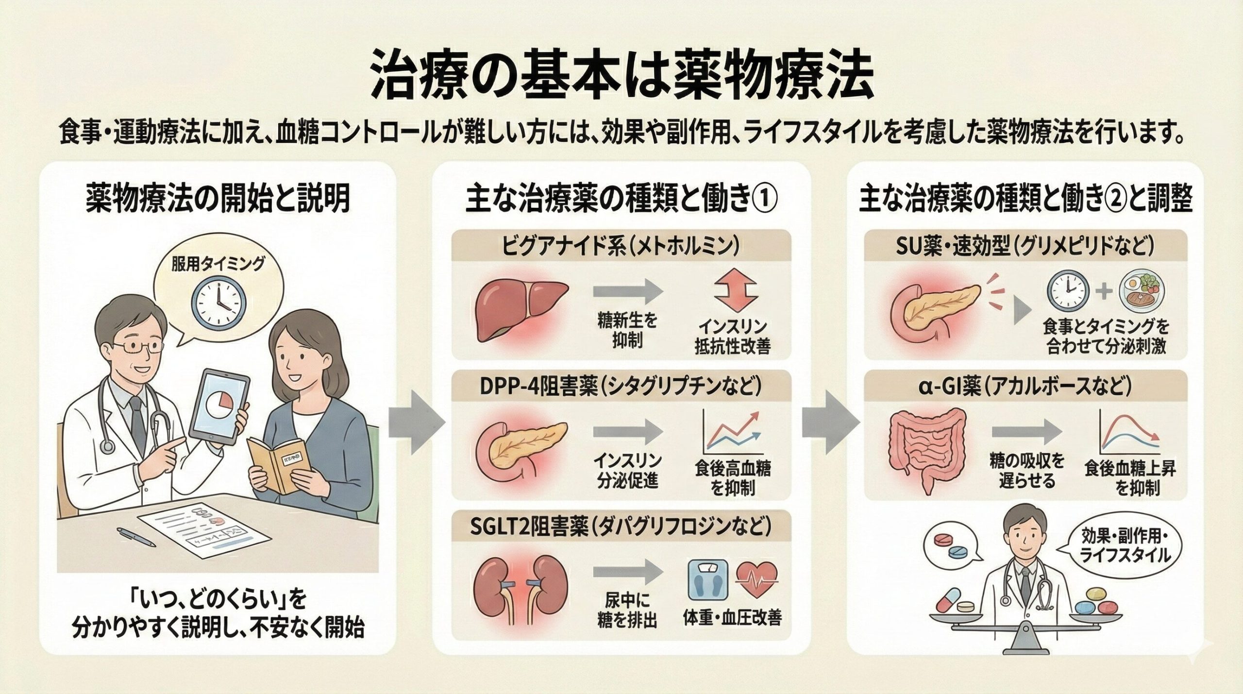 • DPP-4阻害薬(シタグリプチンなど):インスリン分泌を促進し、食後高血糖を抑える作用があります。