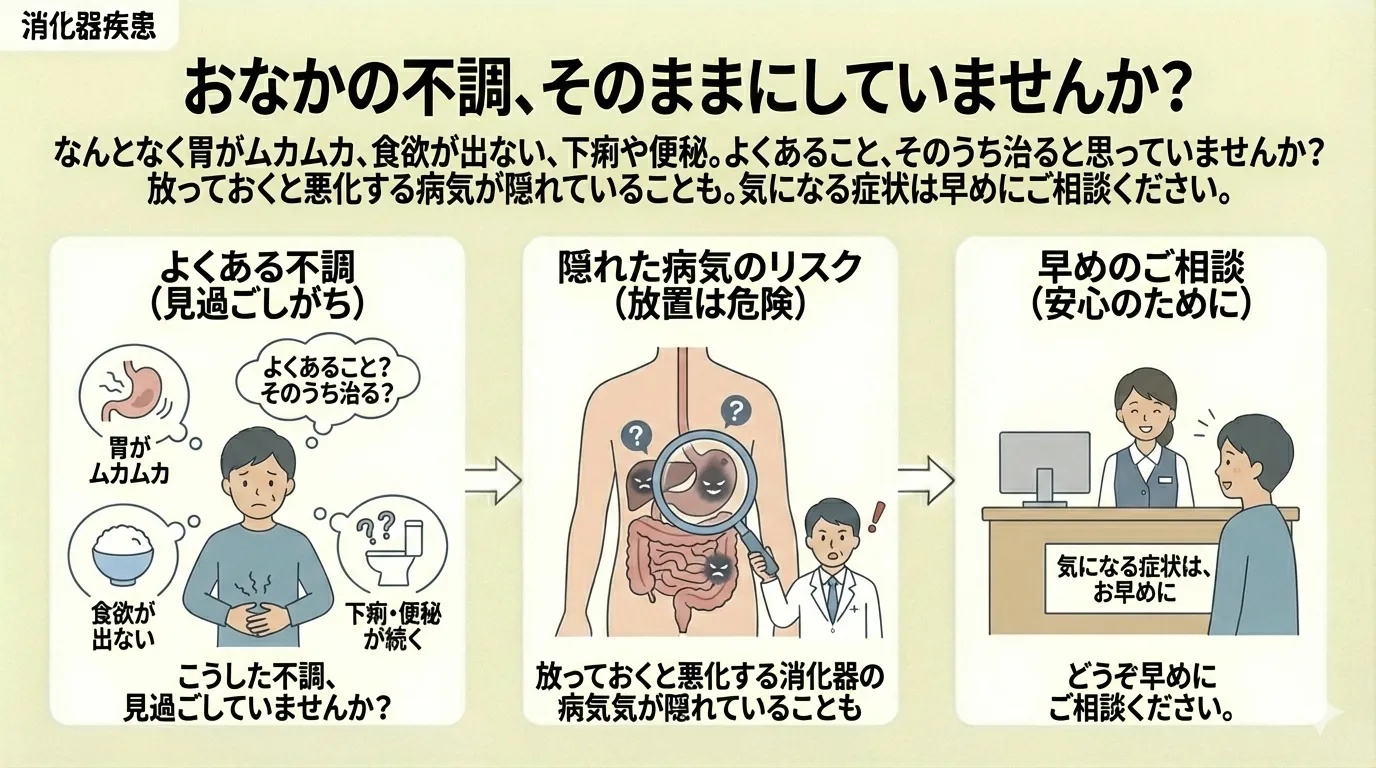 おなかの不調の中には、放っておくと悪化してしまう消化器の病気が隠れていることもあります。気になる症状がある方は、どうぞ早めにご相談ください。