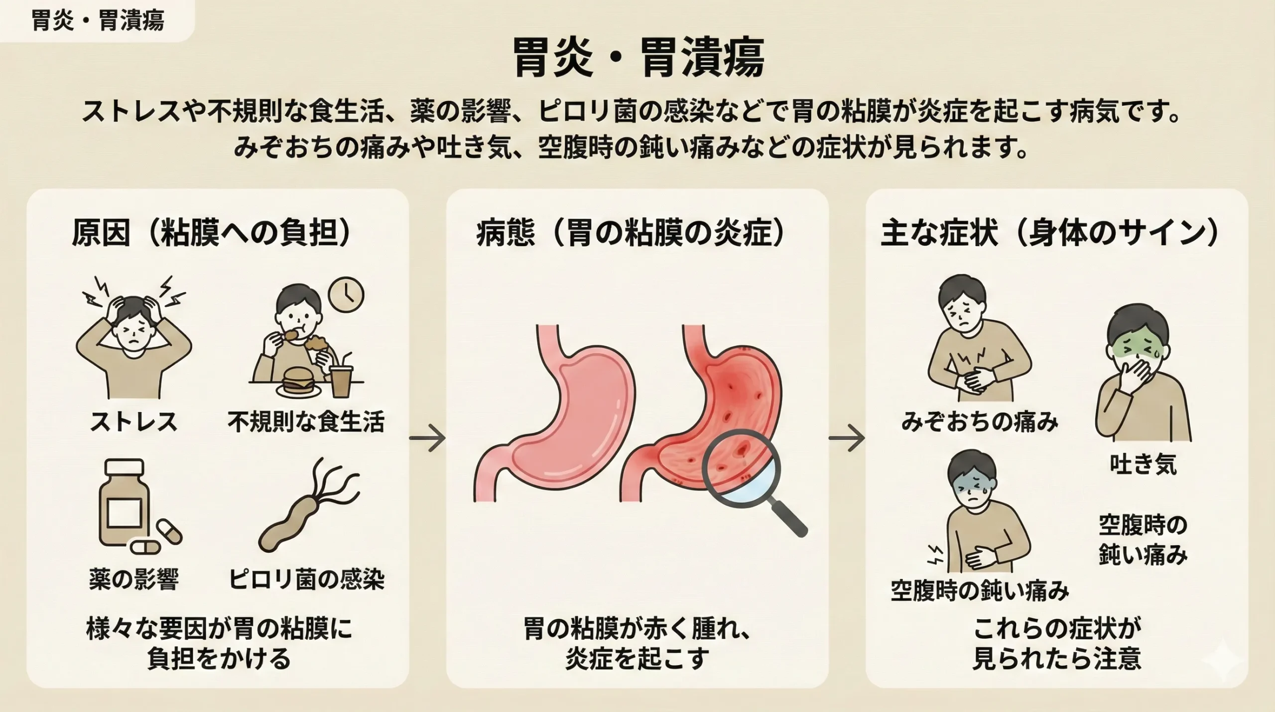ストレスや不規則な食生活、薬の影響、ピロリ菌の感染などで胃の粘膜が炎症を起こす病気です。みぞおちの痛みや吐き気、空腹時の鈍い痛みなどの症状が見られます。