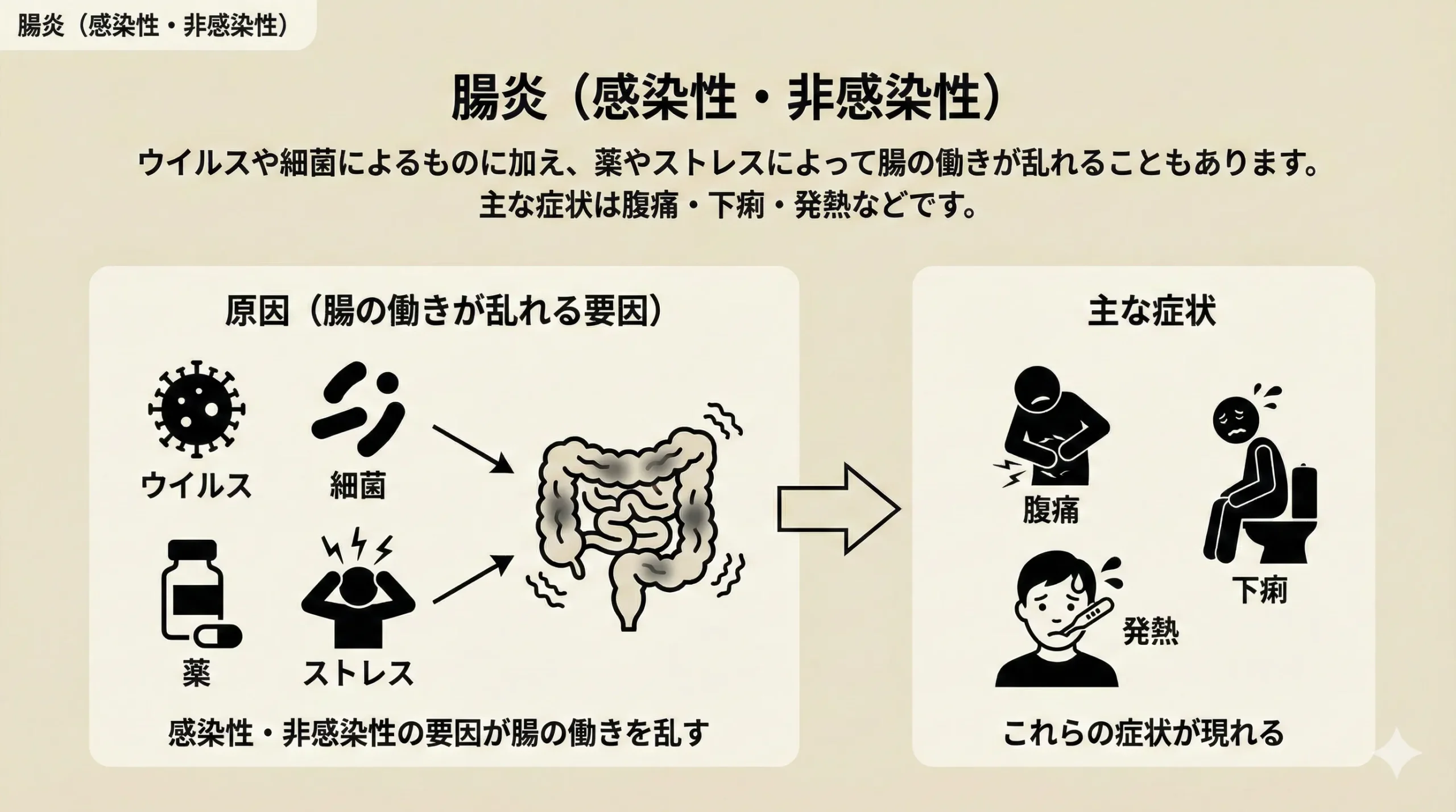 ウイルスや細菌によるものに加え、薬やストレスによって腸の働きが乱れることもあります。主な症状は腹痛・下痢・発熱などです。