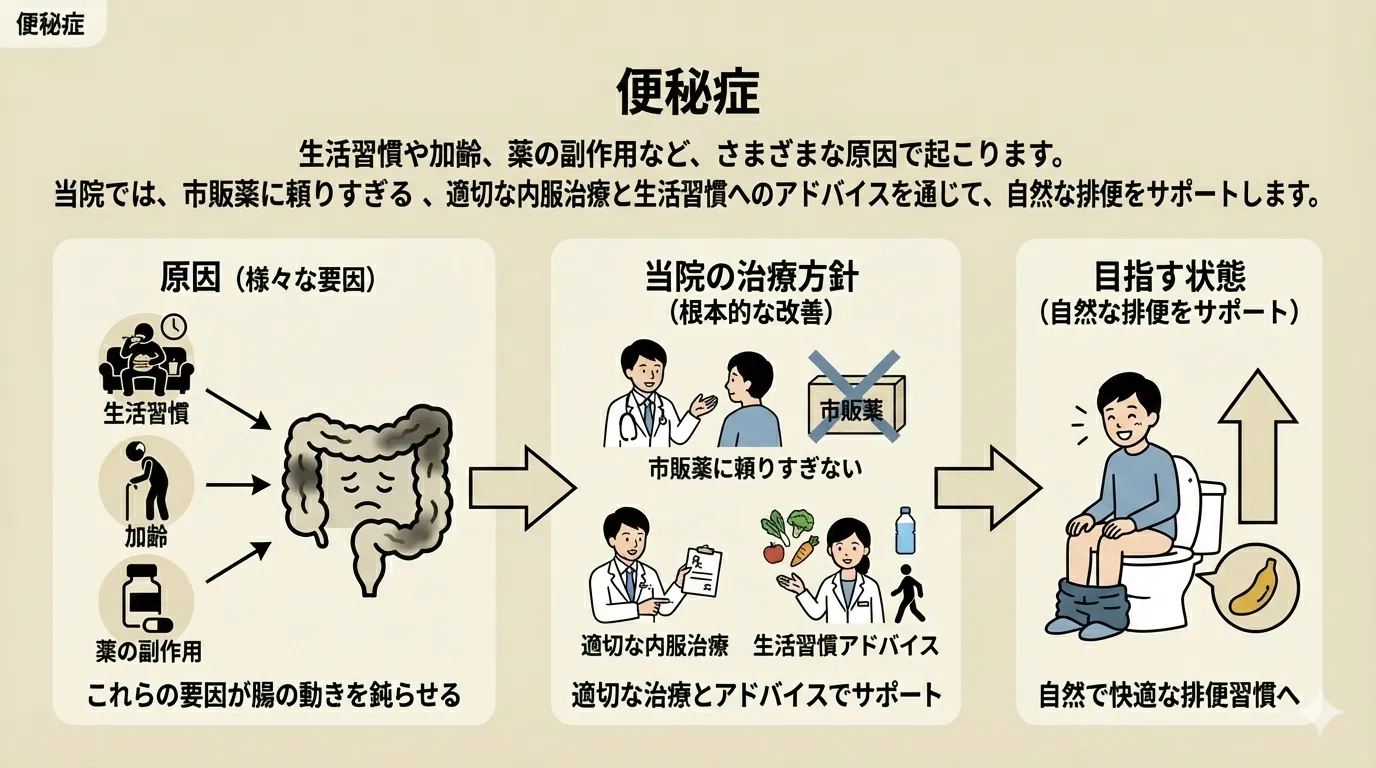 生活習慣や加齢、薬の副作用など、さまざまな原因で起こります。当院では、市販薬に頼りすぎることなく、適切な内服治療と生活習慣へのアドバイスを通じて、自然な排便をサポートします。
