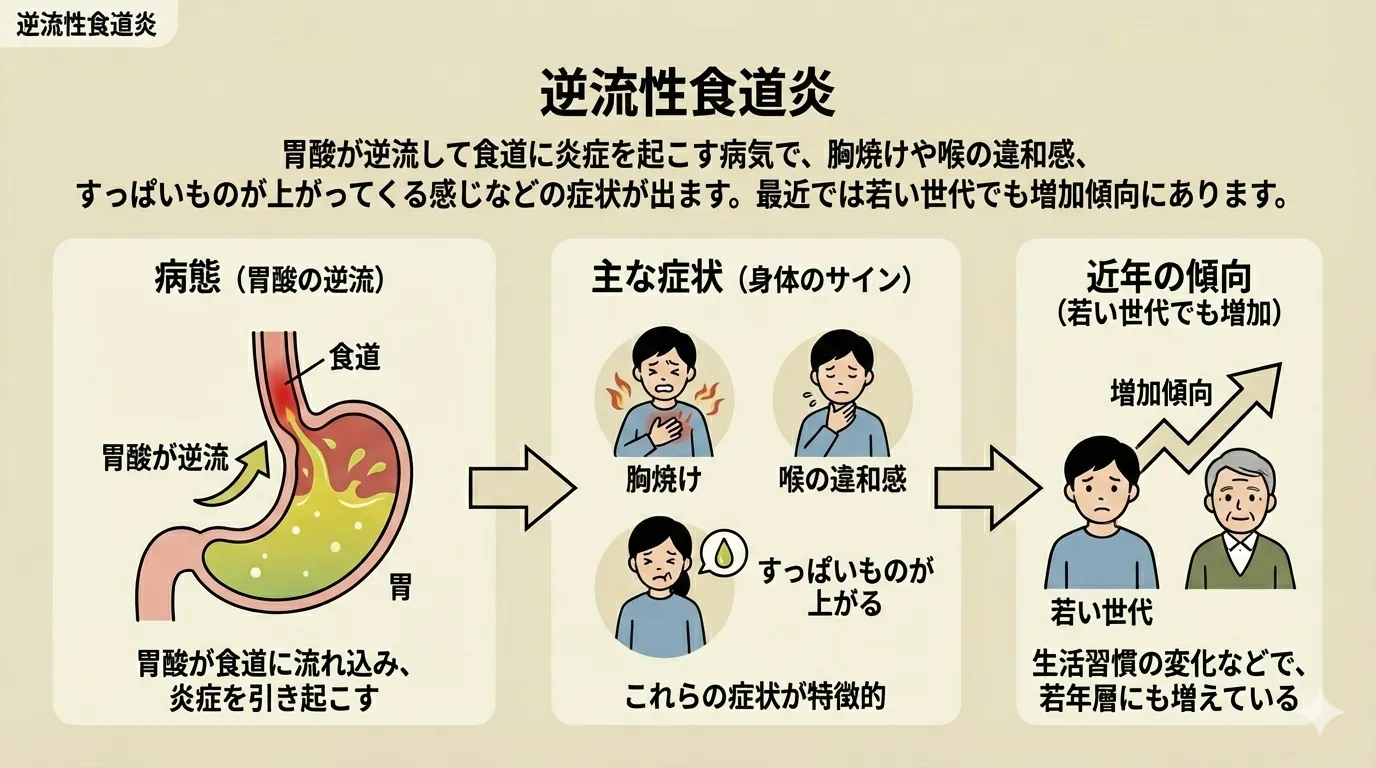 胃酸が逆流して食道に炎症を起こす病気で、胸焼けや喉の違和感、すっぱいものが上がってくる感じなどの症状が出ます。最近では若い世代でも増加傾向にあります。