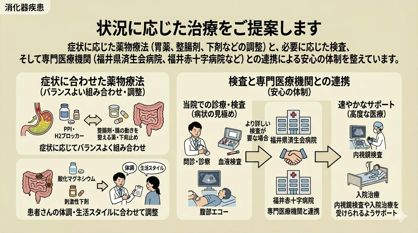 診療の中では、問診や診察に加えて、必要に応じて血液検査や腹部エコーを行い、病状を見極めます。より詳しい検査が必要な場合には、福井県済生会病院や福井赤十字病院などの専門医療機関と連携し、速やかに内視鏡検査や入院治療を受けられるようサポートしています。