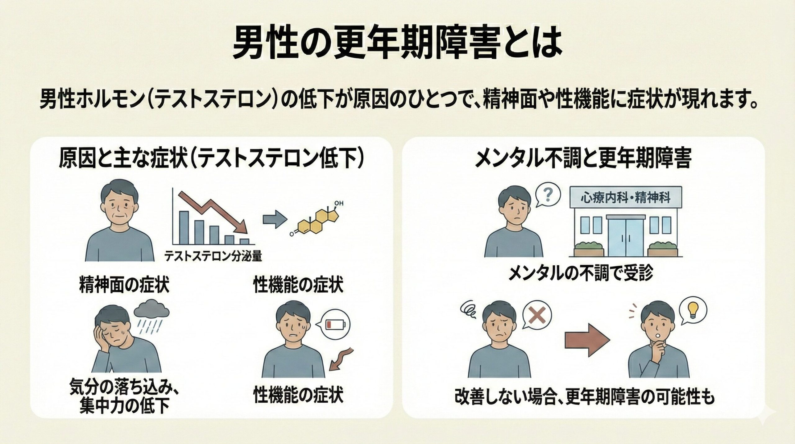 男性更年期障害には、気分の落ち込みや集中力の低下といった精神面の症状と、性機能の症状があります。メンタルの状態が最初に低下して、心療内科や精神科を受診し治療しても良くならない方もいますが、そうした方の中には更年期障害の男性もいるのです。