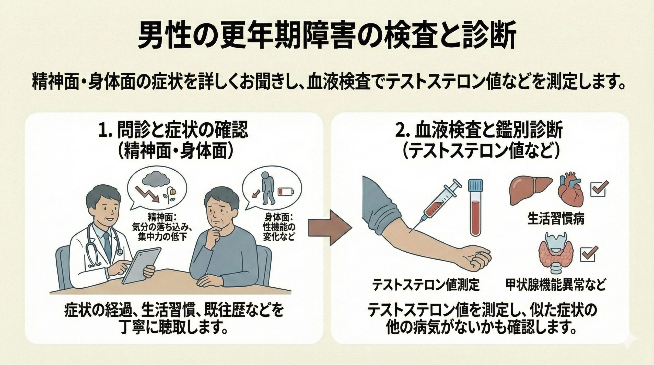 この時点で更年期障害が疑われる場合は、血液検査でテストステロン値を測定します。それとあわせて、生活習慣病や甲状腺機能異常など、似た症状を引き起こす他の病気がないかも確認します。