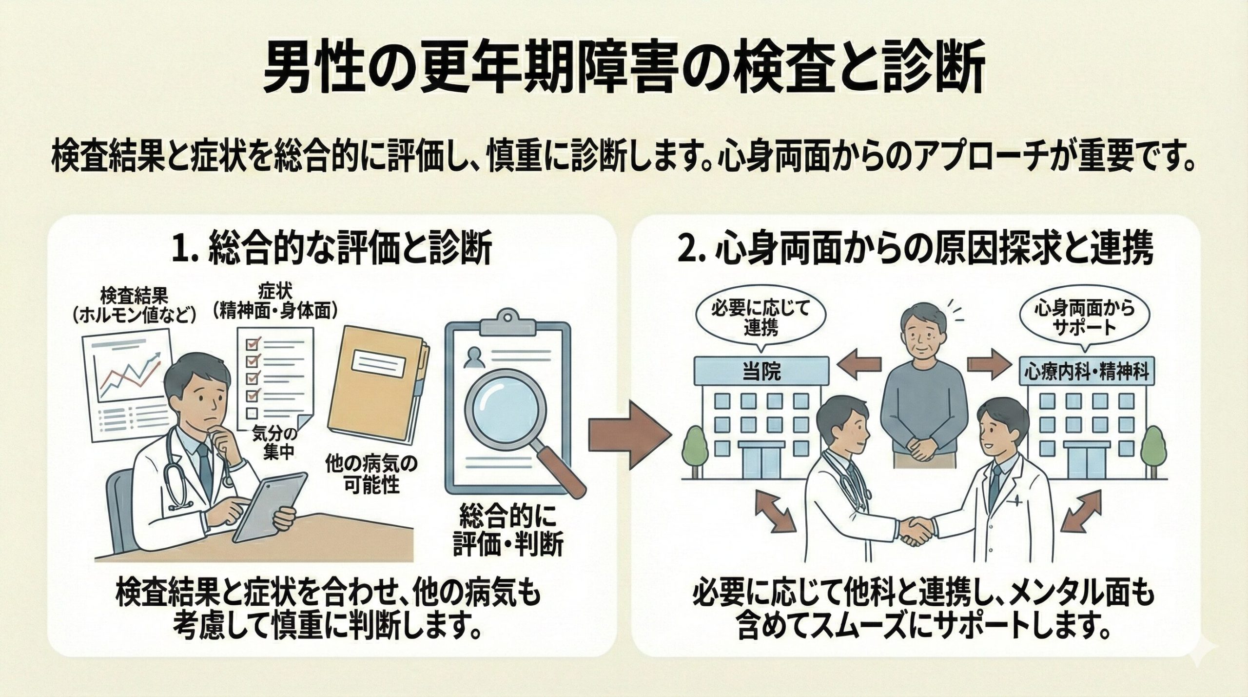 検査結果と症状を総合的に評価し、男性更年期障害の可能性を判断します。精神的な不調が先行してホルモン値が低下しているケースや、他の病気が背景にあるケースもあるため、診断には慎重さが求められます。