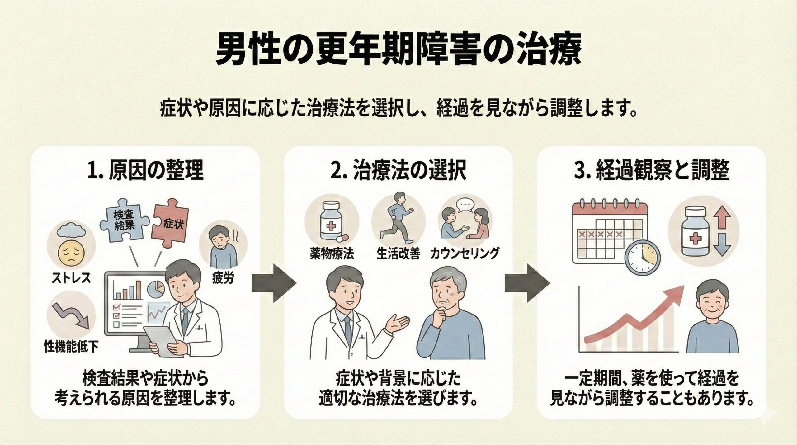 男性の更年期障害は、症状や背景によって原因がさまざまです。まずは検査結果や症状から考えられる原因を整理して、それに応じて治療します。場合によっては、原因を特定するために、一定期間、薬を使って経過を見ながら調整することもあります。