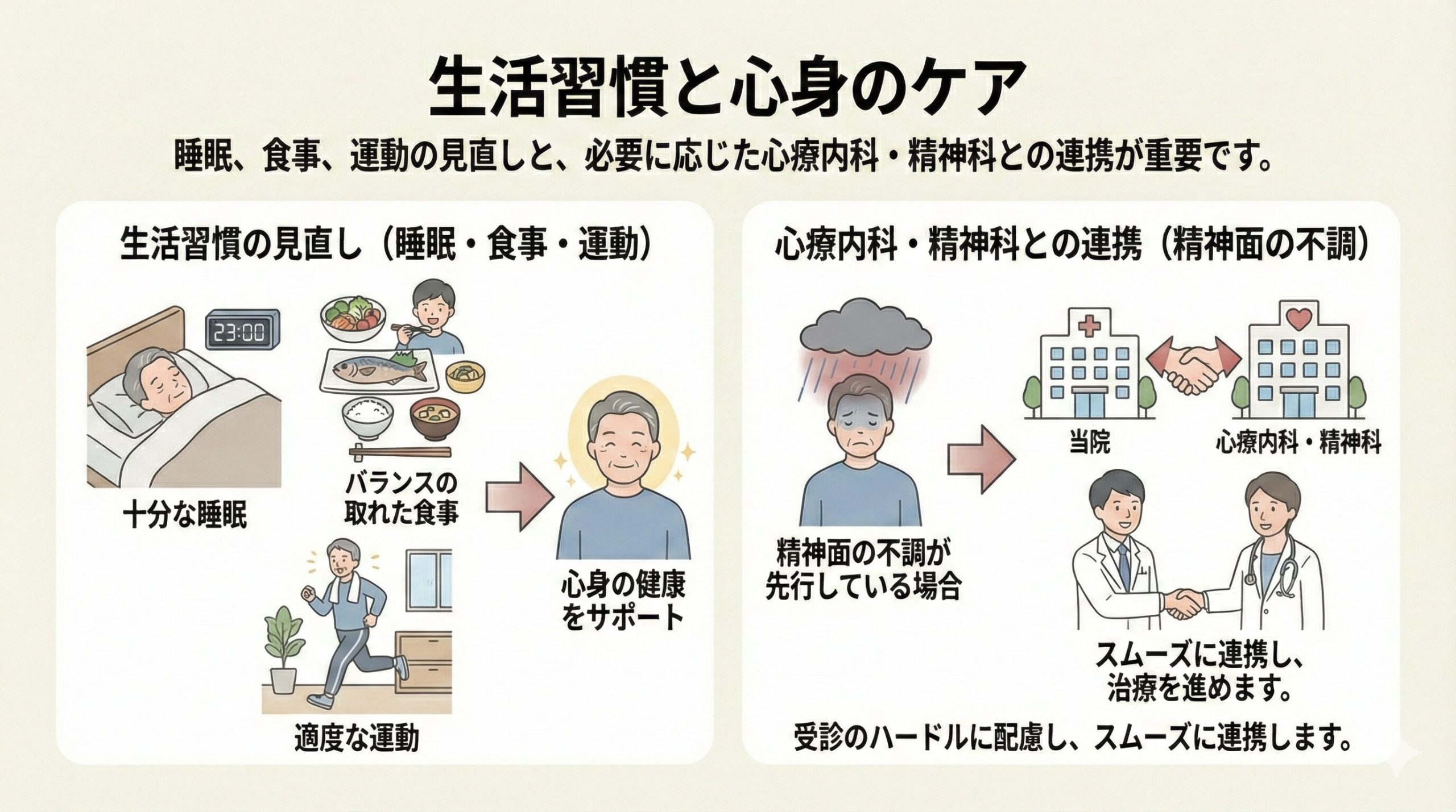 当院では必要に応じて心療内科や精神科との連携も行い、心身両面から原因を探ります。メンタル面の受診が負担になる方にも、スムーズに連携できるよう配慮しています。