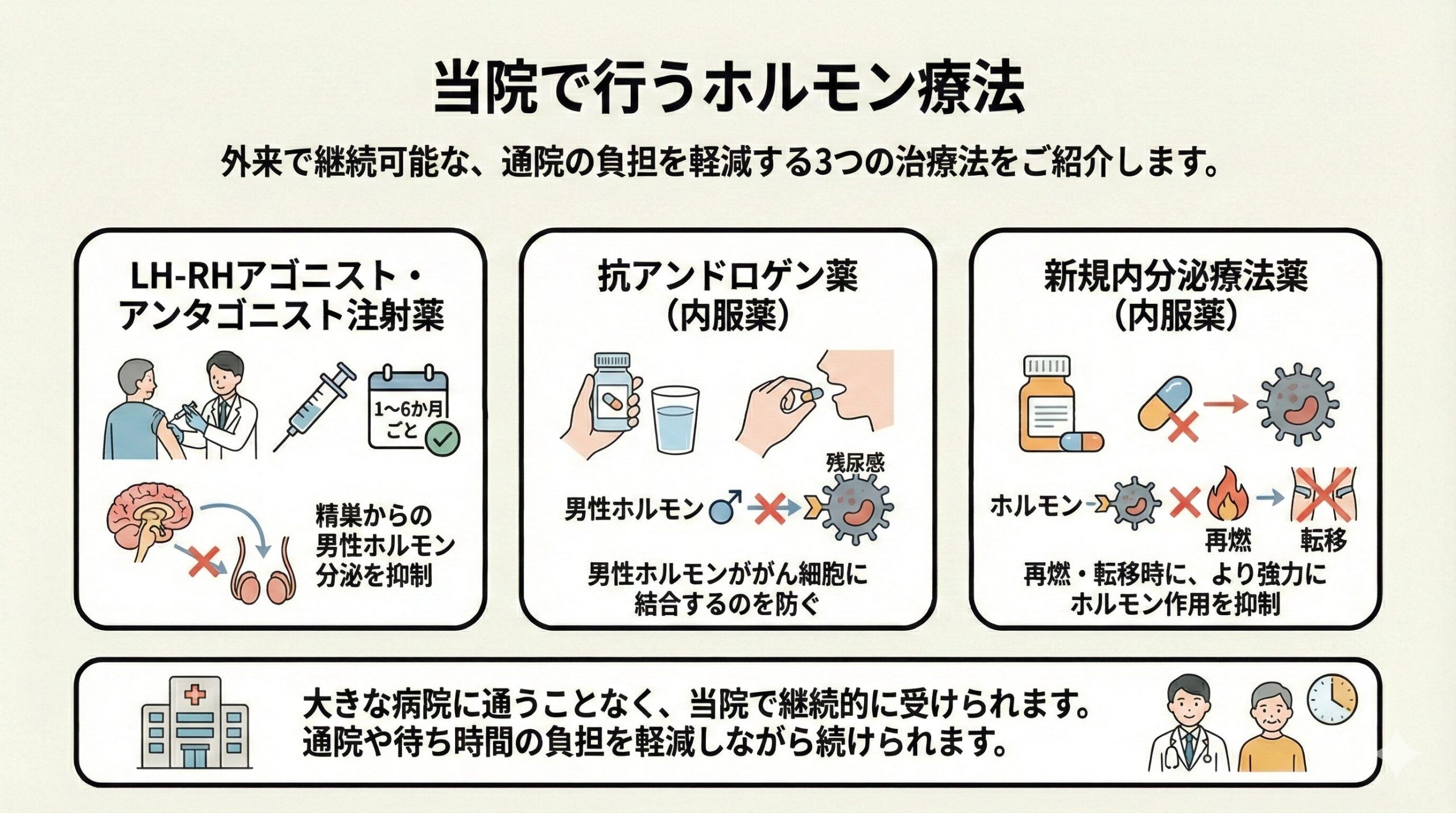 当院では外来で次のようなホルモン療法を実施しています。 ・LH-RHアゴニスト・アンタゴニスト注射薬:1〜6か月ごとに皮下に注射する方法です。精巣から男性ホルモンが分泌されるのを抑えます。 ・抗アンドロゲン薬:内服薬で、男性ホルモンががん細胞に結合するのを防ぎます。 ・新規内分泌療法薬:内服薬で、がんの再燃や転移を伴う場合に、より強力にホルモンの作用を抑えます。 これらの治療は大きな病院に通うことなく、当院で継続的に受けられます。長期間にわたる治療でも、通院や待ち時間の負担を軽減しながら続けていただけます。