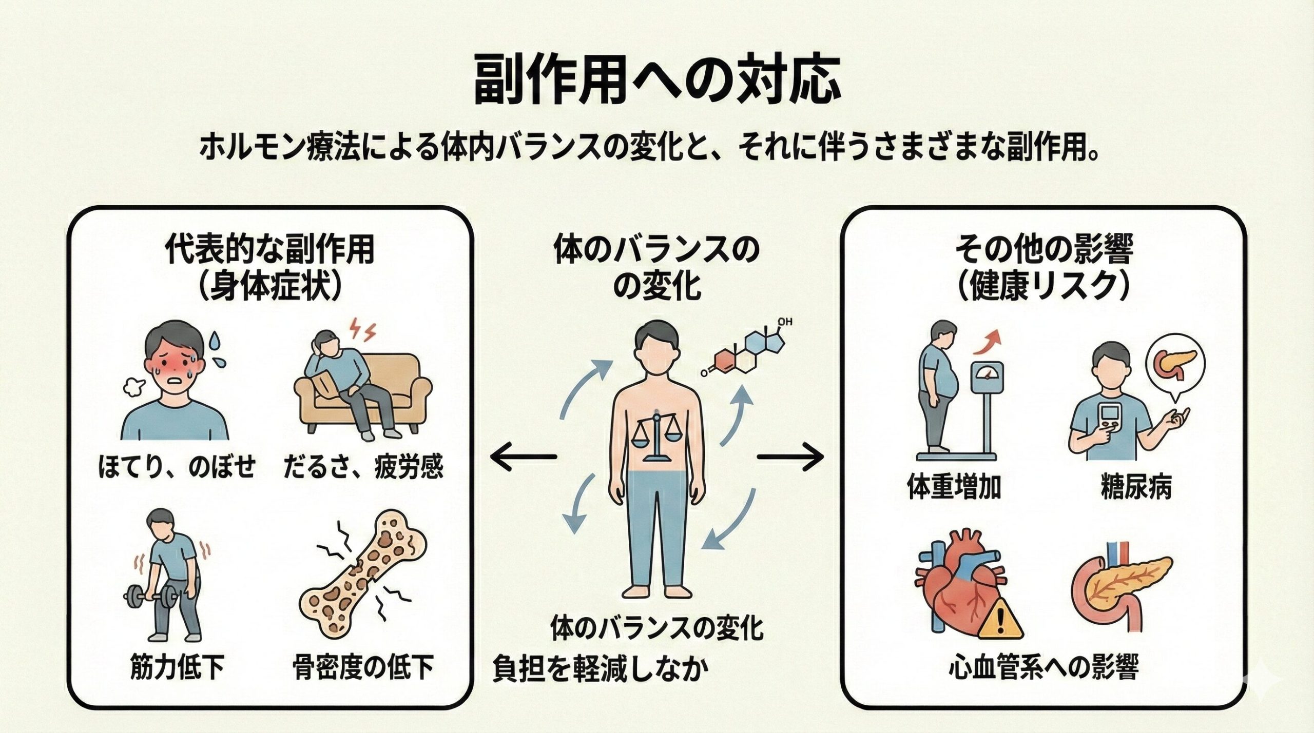 ホルモン療法では、男性ホルモンの働きを抑えるために体内のバランスが変化し、さまざまな副作用が生じることがあります。代表的なものには、