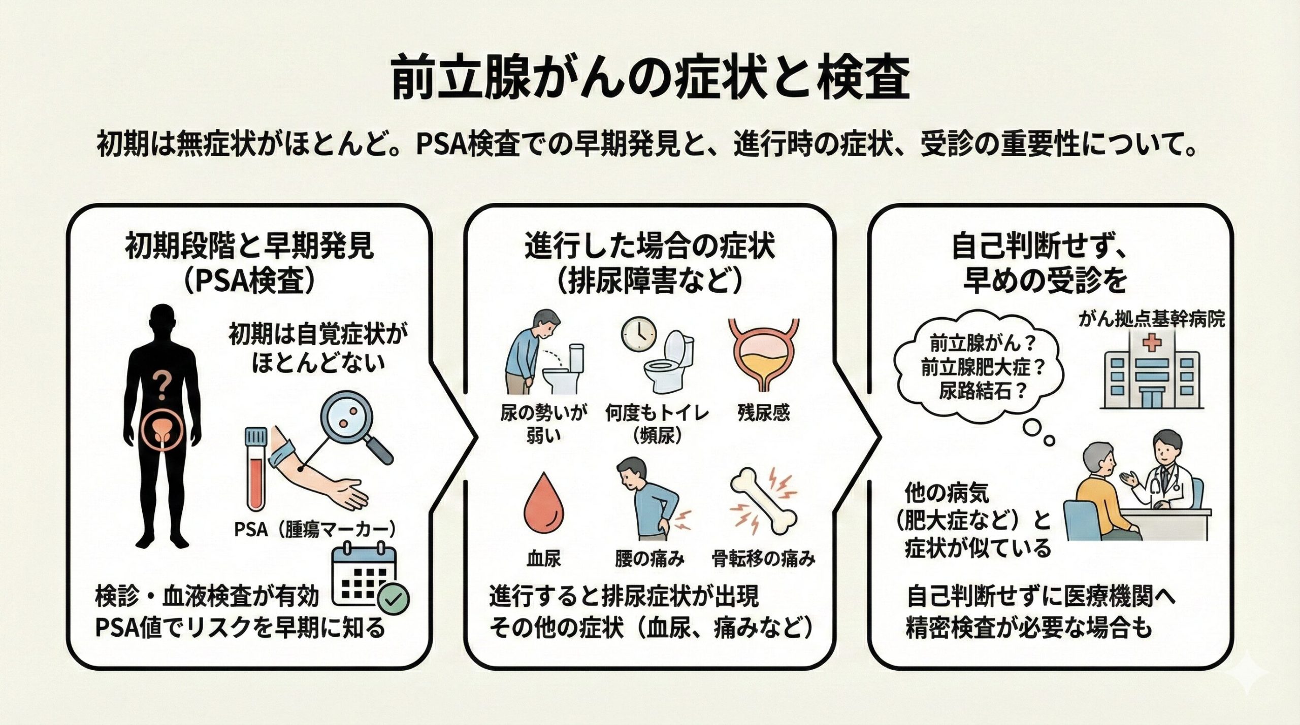 前立腺がんは初期の段階では自覚症状がほとんどありません。そのため、検診や血液検査が早期発見に大きな役割を果たします。特に健康診断で測定されるPSA(前立腺がんの腫瘍マーカー)は、前立腺がんのリスクを早めに知る有効な手段です。PSA値が高い場合には、追加の精密検査が必要となります。 一方で、がんがある程度進行すると、排尿に関わる症状が出てくることがあります。