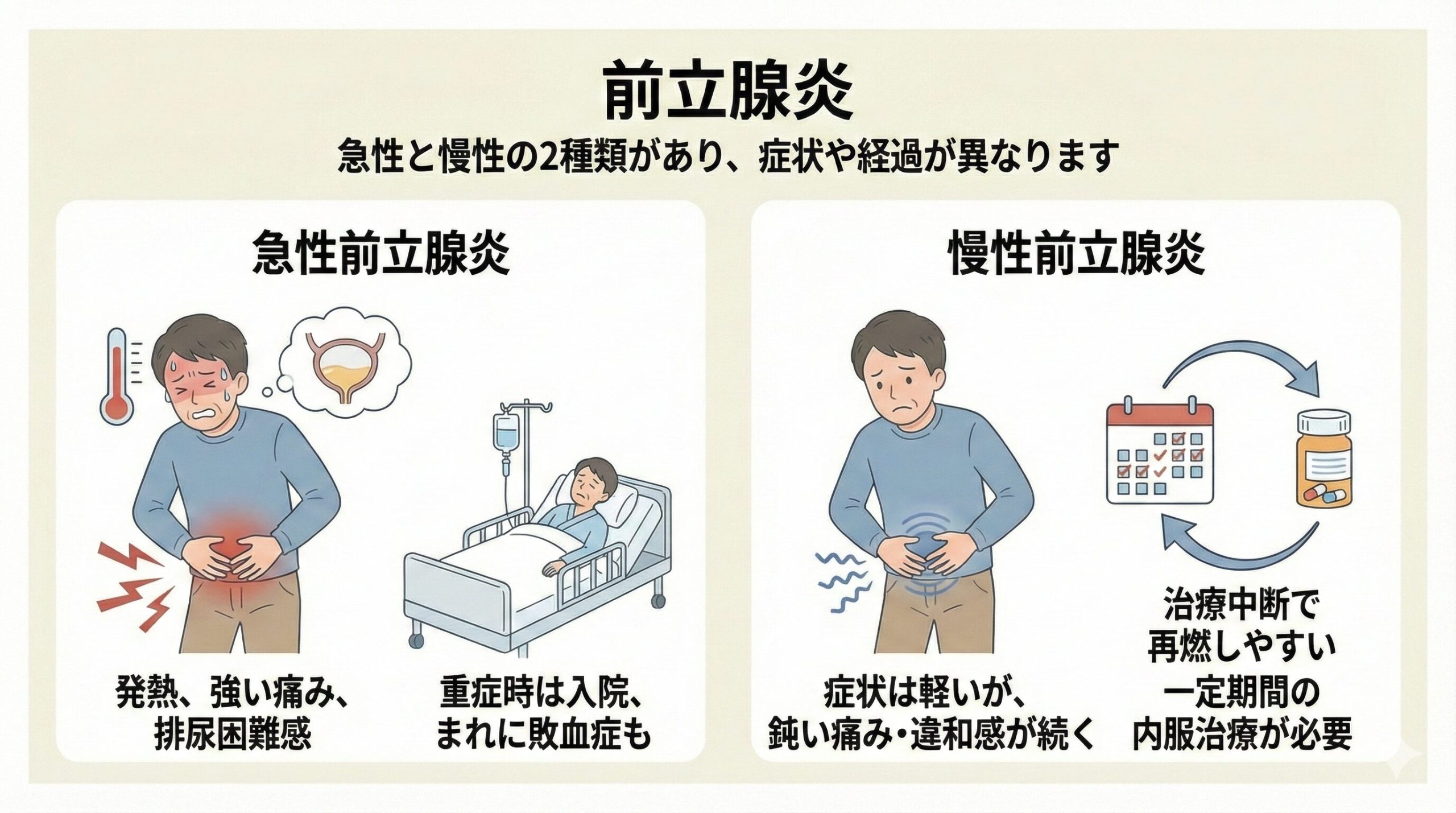 前立腺炎は、大きく分けて急性と慢性の2種類があります。急性の場合は、発熱や排尿困難感、強い痛みが特徴で、重症時には入院が必要になることもあり、まれに敗血症に進展することもあります。