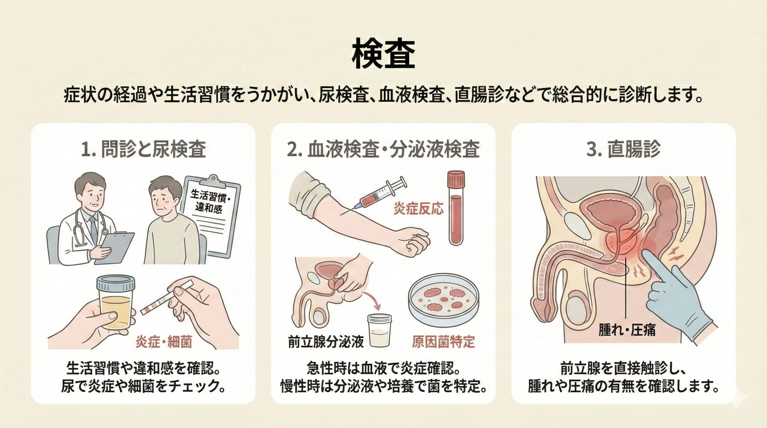 急性の場合は血液検査で炎症反応や感染の程度を確認します。慢性の場合は尿検査で異常が出にくいこともあるため、前立腺マッサージ後の分泌液検査(前立腺分泌液検査)や、尿培養検査で原因菌と有効な抗菌薬を特定します。