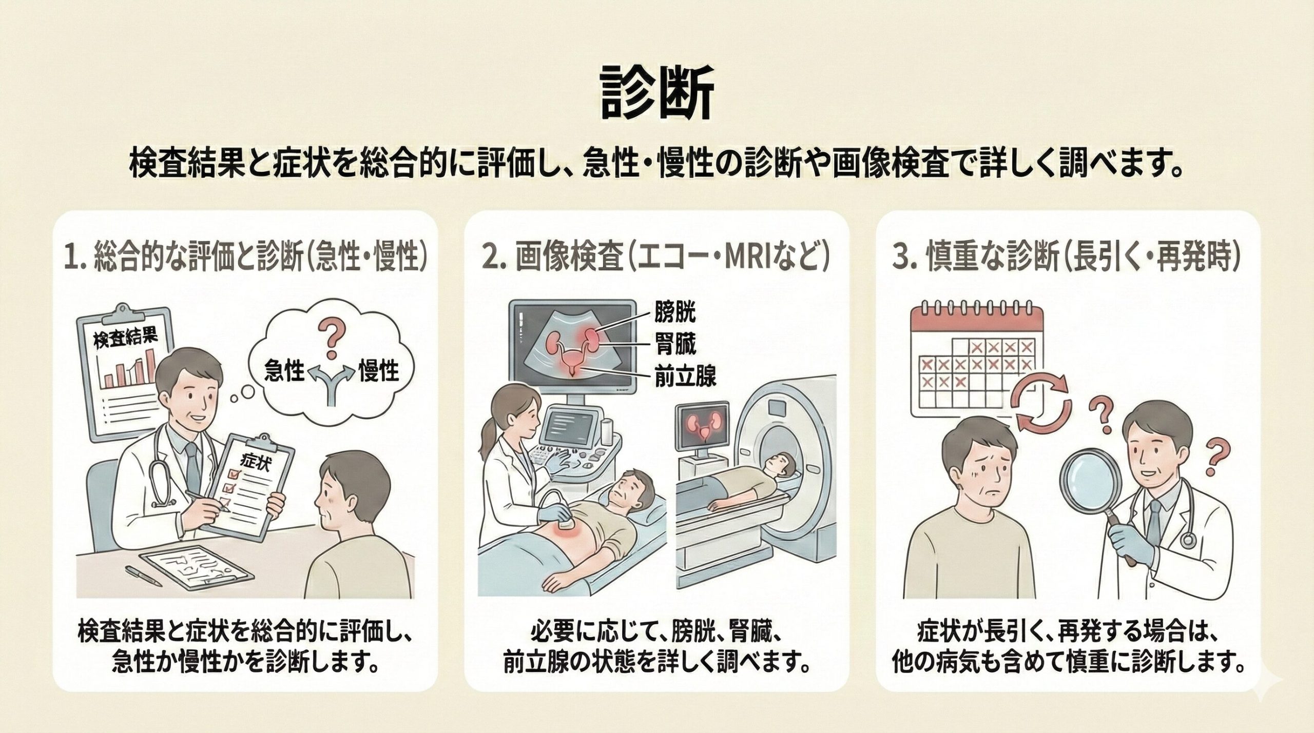 検査結果と症状を総合的に評価し、急性か慢性かを診断します。必要に応じて、腹部エコーやMRIなどの画像検査を行い、膀胱ぼうこう、腎臓、前立腺の状態を詳しく調べます。症状が長引く場合や再発を繰り返す場合は、他の病気が隠れていないかも含めて慎重に診断します。