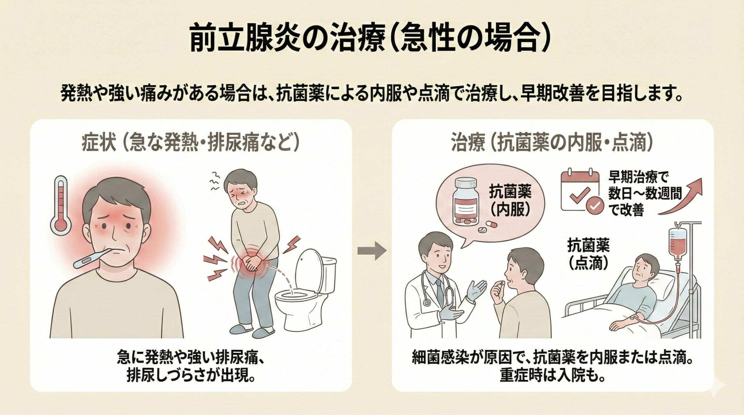 急に発熱や強い排尿痛、排尿しづらさが出た場合は、急性前立腺炎が考えられます。原因の多くは細菌感染で、抗菌薬を内服して治療します。重症の場合や高熱が続く場合は、入院して点滴の抗菌薬を使うこともあります。早期に適切な治療を行えば、多くは数日〜数週間で改善します。