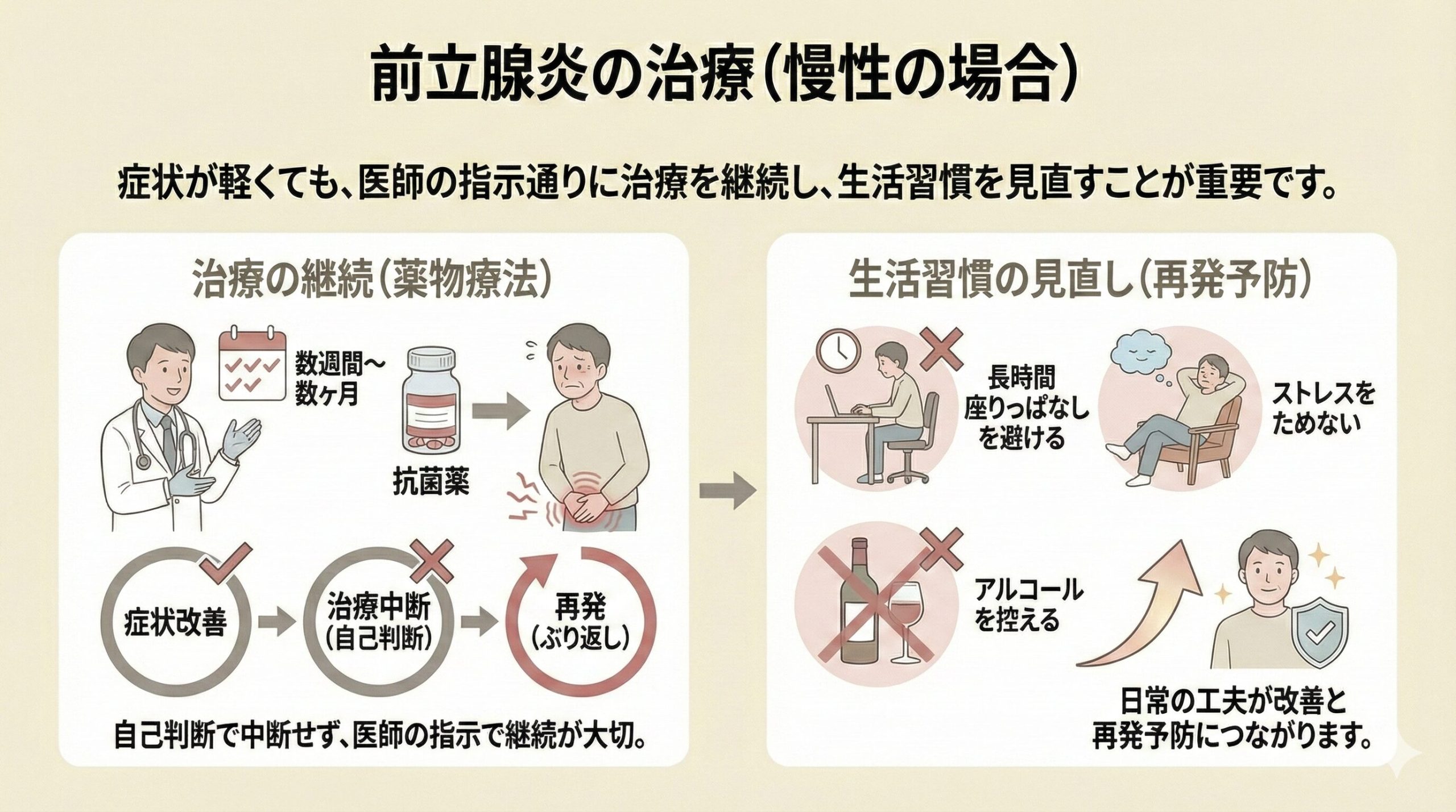 痛みや違和感が軽くても長く続く場合は、慢性前立腺炎の可能性があります。抗菌薬を数週間から数か月服用し、症状の再発を防ぎます。症状が落ち着いても治療を途中でやめると、数か月後にぶり返すことがあるため、医師の指示に沿った継続治療が大切です。