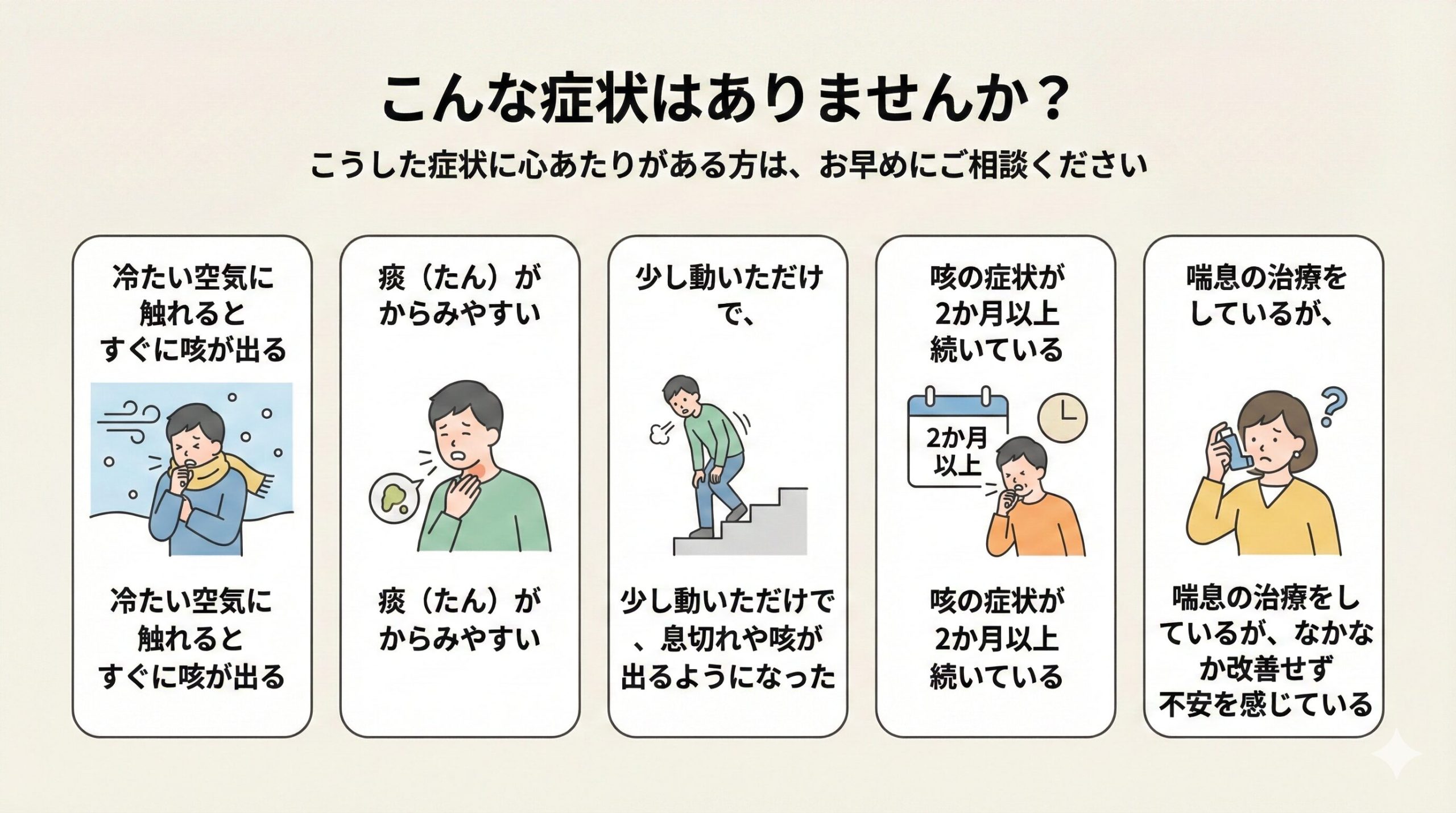 - 少し動いただけで、息切れや咳が出るようになった少し動いただけで、息切れや咳が出るようになった