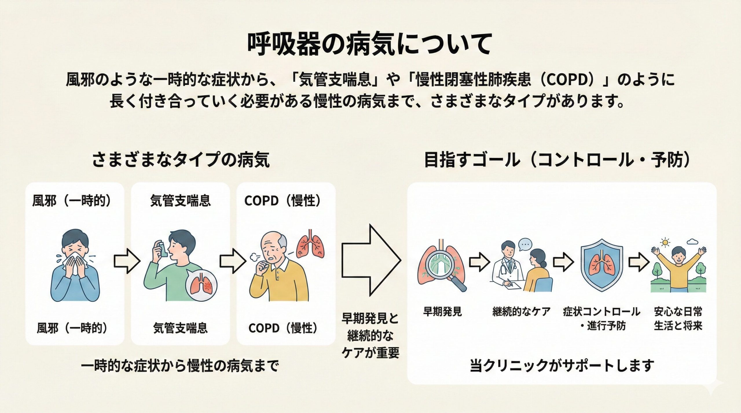 呼吸器の病気には、風邪のような一時的な症状から、「気管支喘息」や「慢性閉塞性肺疾患(COPD)」のように長く付き合っていく必要がある慢性の病気まで、さまざまなタイプがあります。