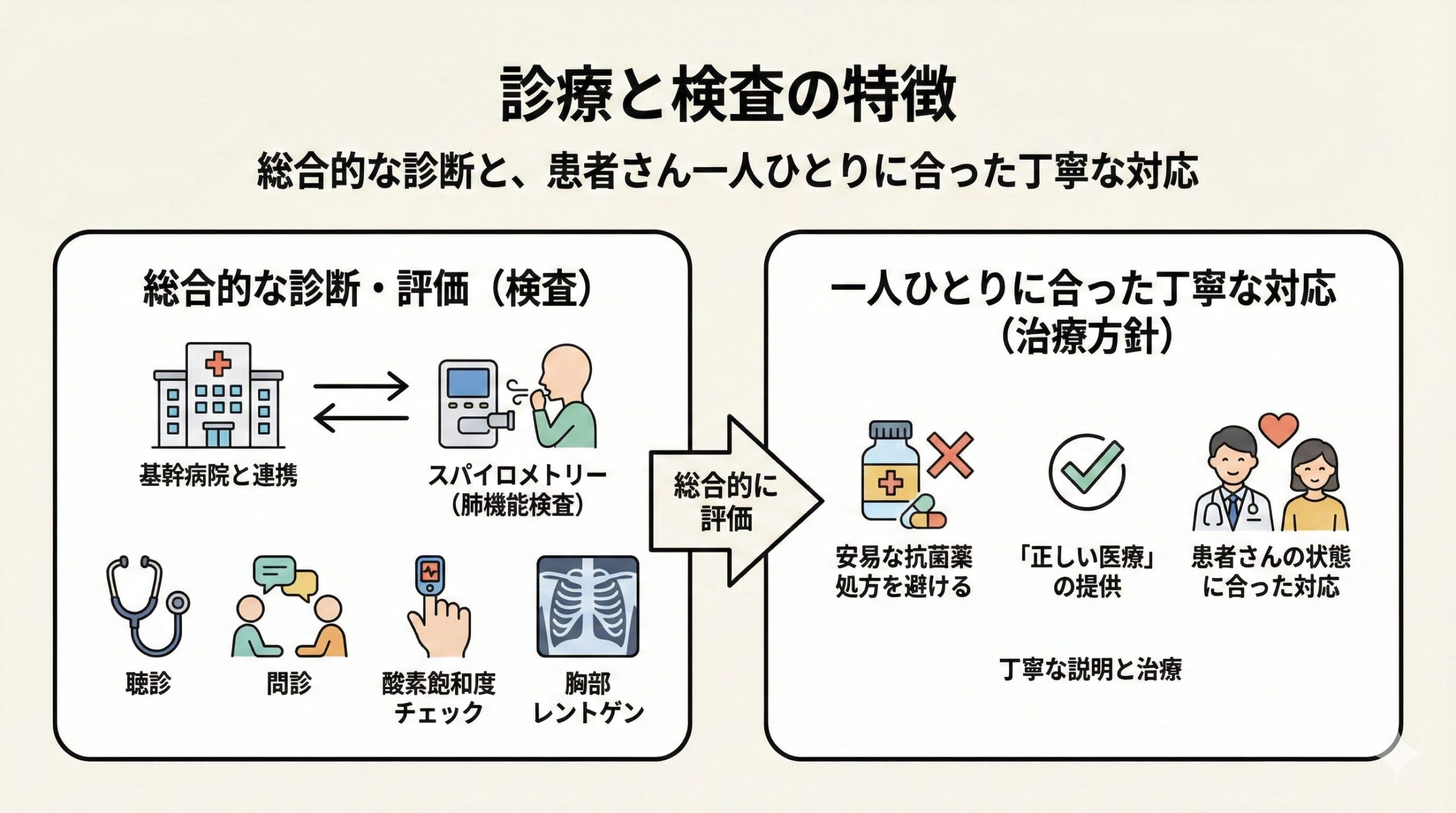 抗菌薬の安易な処方は避け、「正しい医療」を提供するという姿勢のもと、患者さん一人ひとりの状態に合った丁寧な対応を大切にしています。