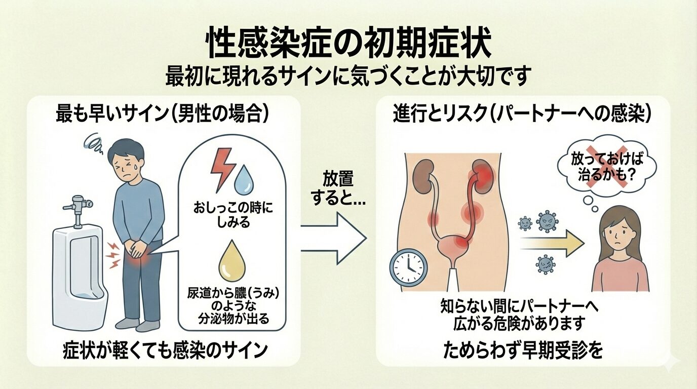 こうした症状は、性感染症(STI)のもっとも早いサインです。放っておけば治るかもと受診をためらう気持ちも分かりますが、症状が軽くても感染は進み、知らない間にパートナーへ広がる危険があります。