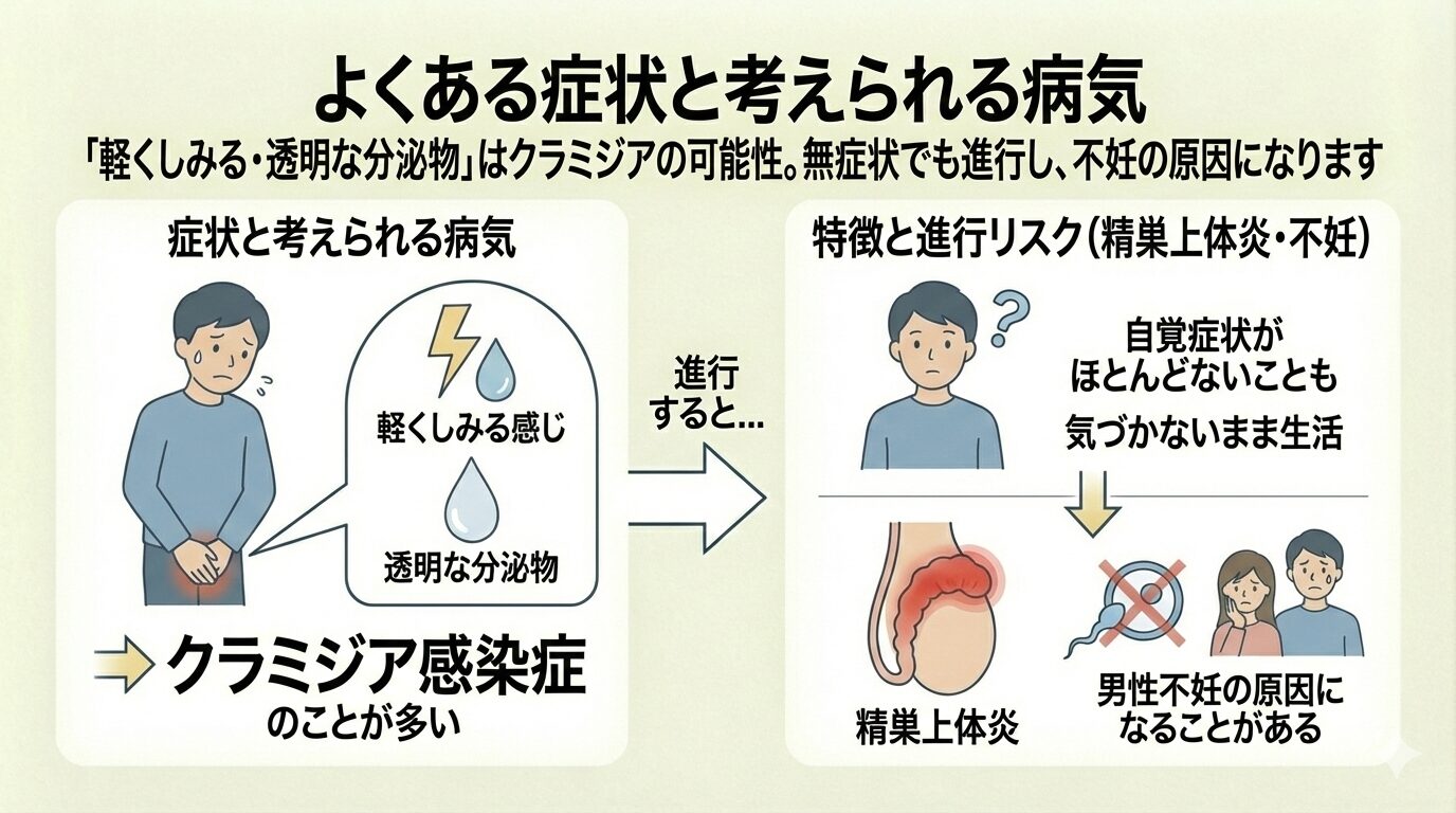 この場合、クラミジア感染症のことが多いです。自覚症状がほとんどないことも珍しくなく、感染に気づかないまま生活してしまう方もいます。進行すると「精巣上体炎」を起こし、男性不妊の原因になることがあります。