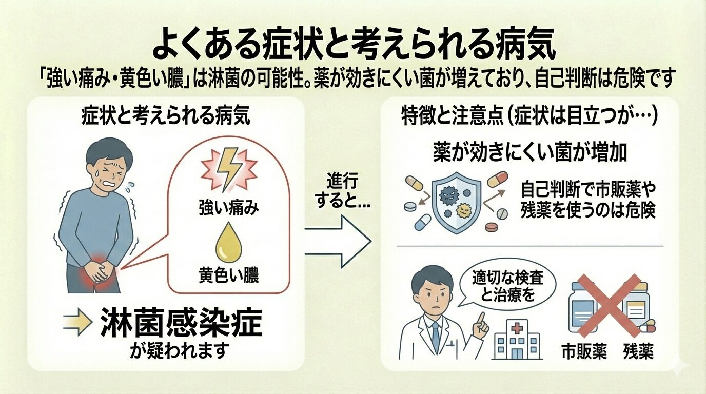 排尿のたびに強くしみて、尿道から黄色い膿のような分泌物が出るときは淋菌感染症が疑われます。症状は目立ちますが、薬が効きにくい菌が増えており、自己判断で市販薬や残薬を使うのは危険です。