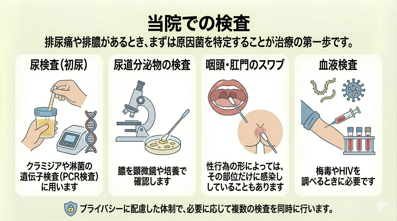 - 尿道分泌物の検査:膿を顕微鏡や培養で確認します