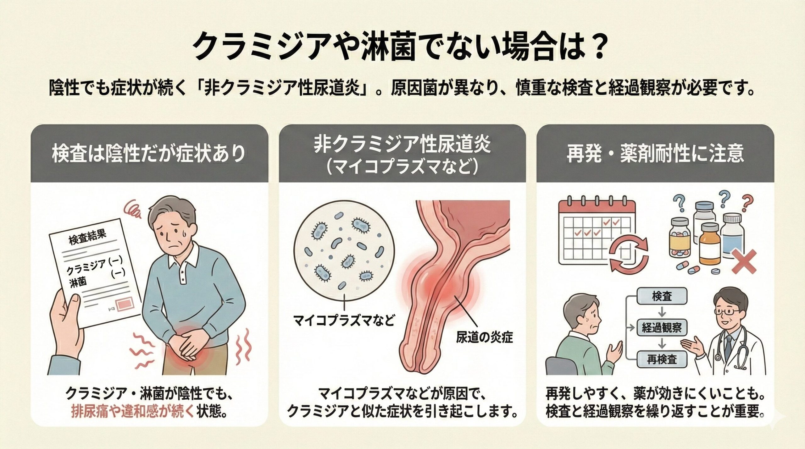 検査でクラミジアや淋菌が陰性でも、症状が続くときは「非クラミジア性尿道炎」が考えられます。マイコプラズマなどが原因で、クラミジアと似た症状を起こします。再発や薬剤の効きにくさが課題になるため、検査と経過観察を繰り返すことが重要です。
