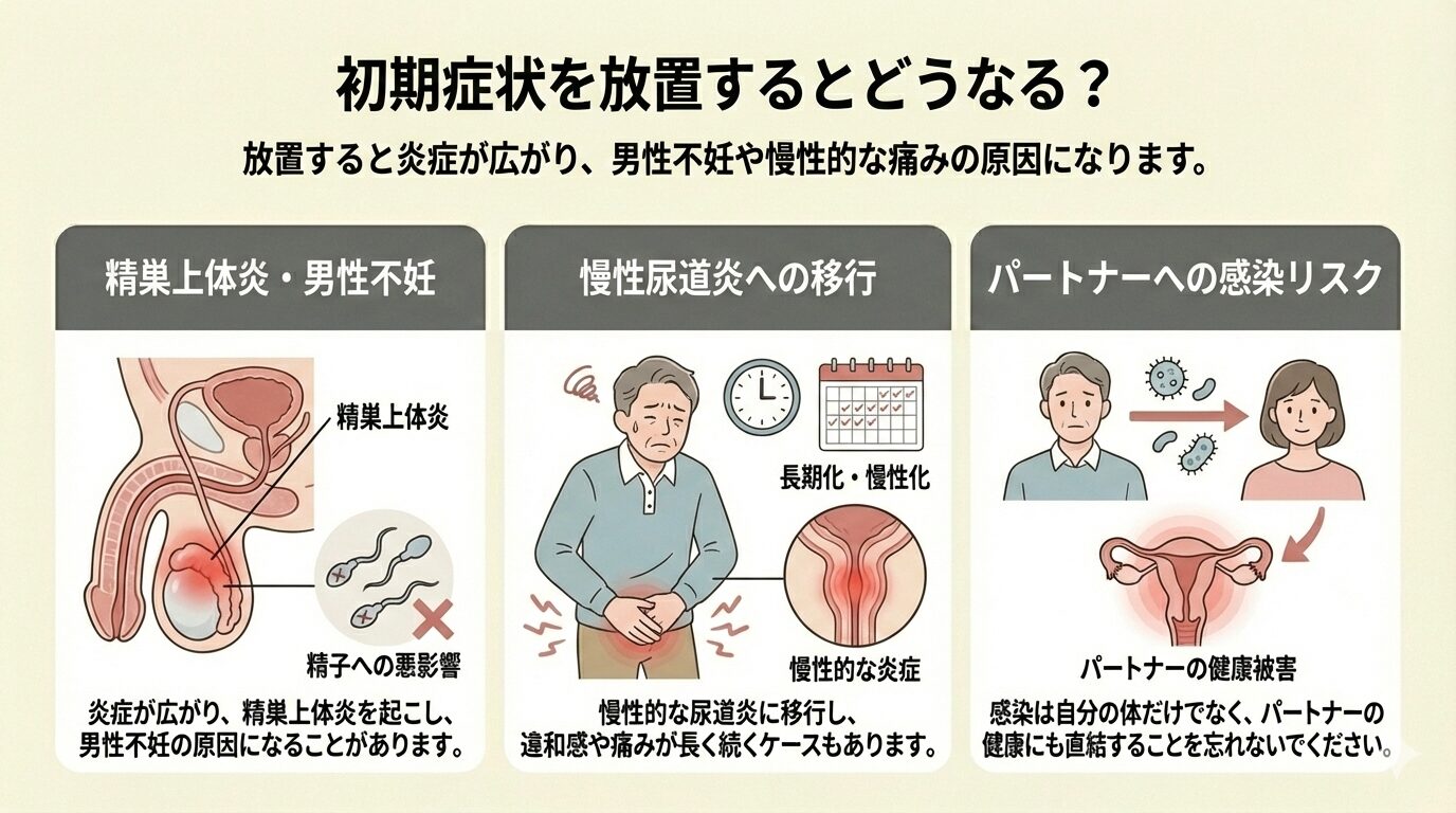 「そのうち良くなる」と思っている間に、炎症が広がり「精巣上体炎」を起こし、男性不妊の原因になることがあります。慢性的な尿道炎に移行し、違和感や痛みが続くケースもあります。感染は自分の体だけでなく、パートナーの健康にも直結することを忘れないでください。