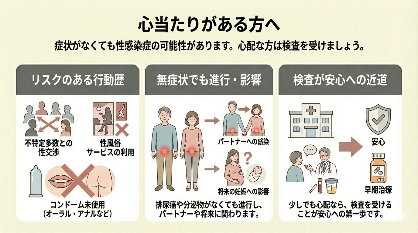 これらの行動歴がある方は、症状の有無に関わらず検査を受けることをおすすめします。性感染症は自分だけの問題ではなく、パートナーや将来の妊娠にも関わることです。少しでも心配なら検査することが安心への近道です。