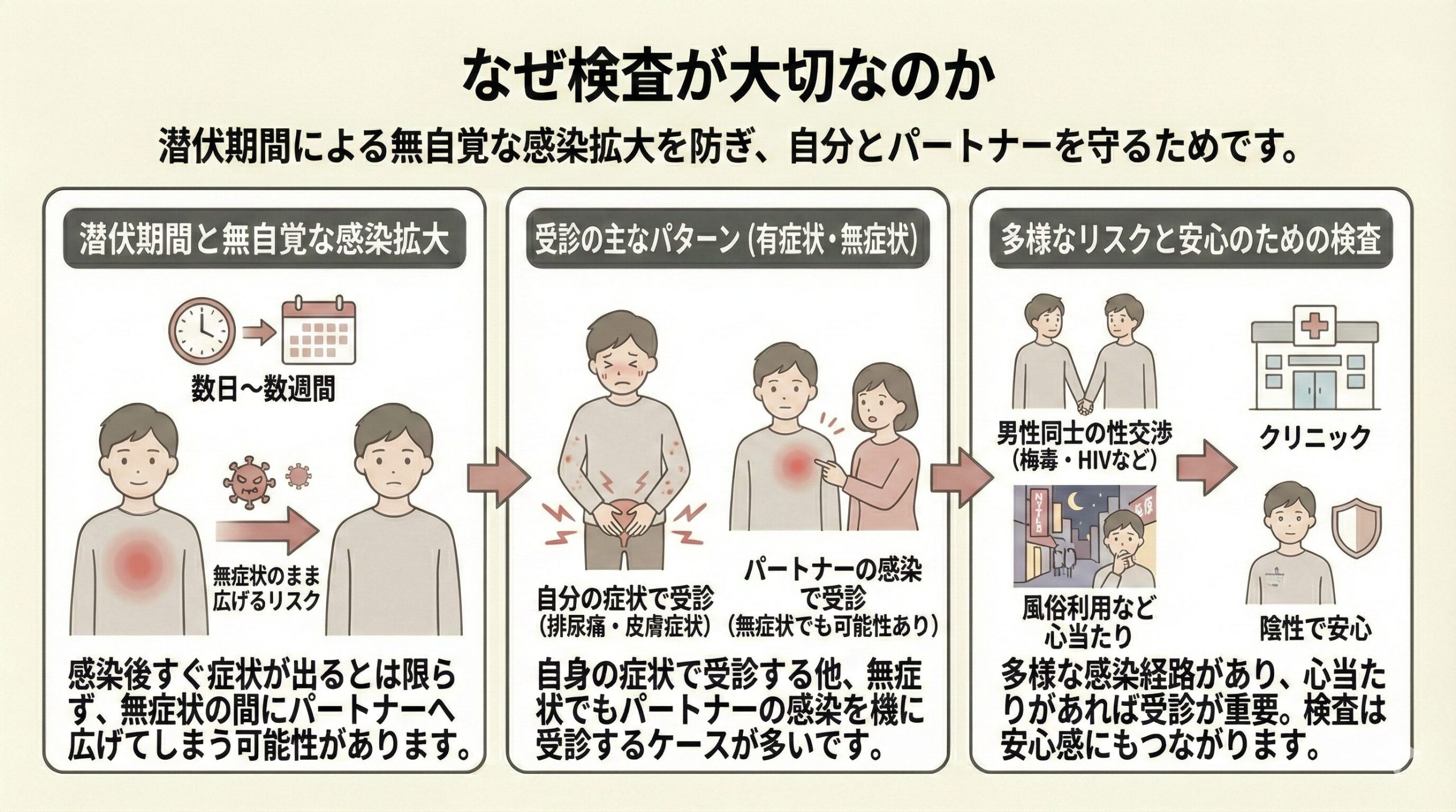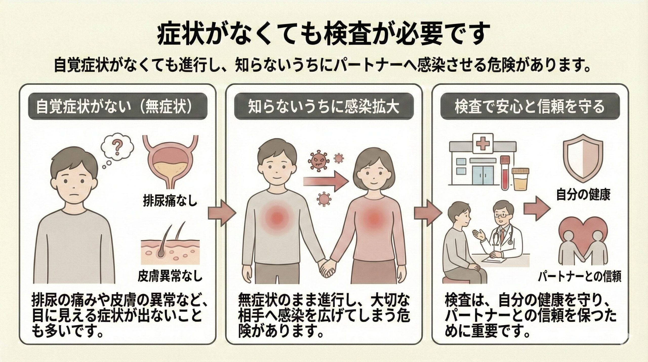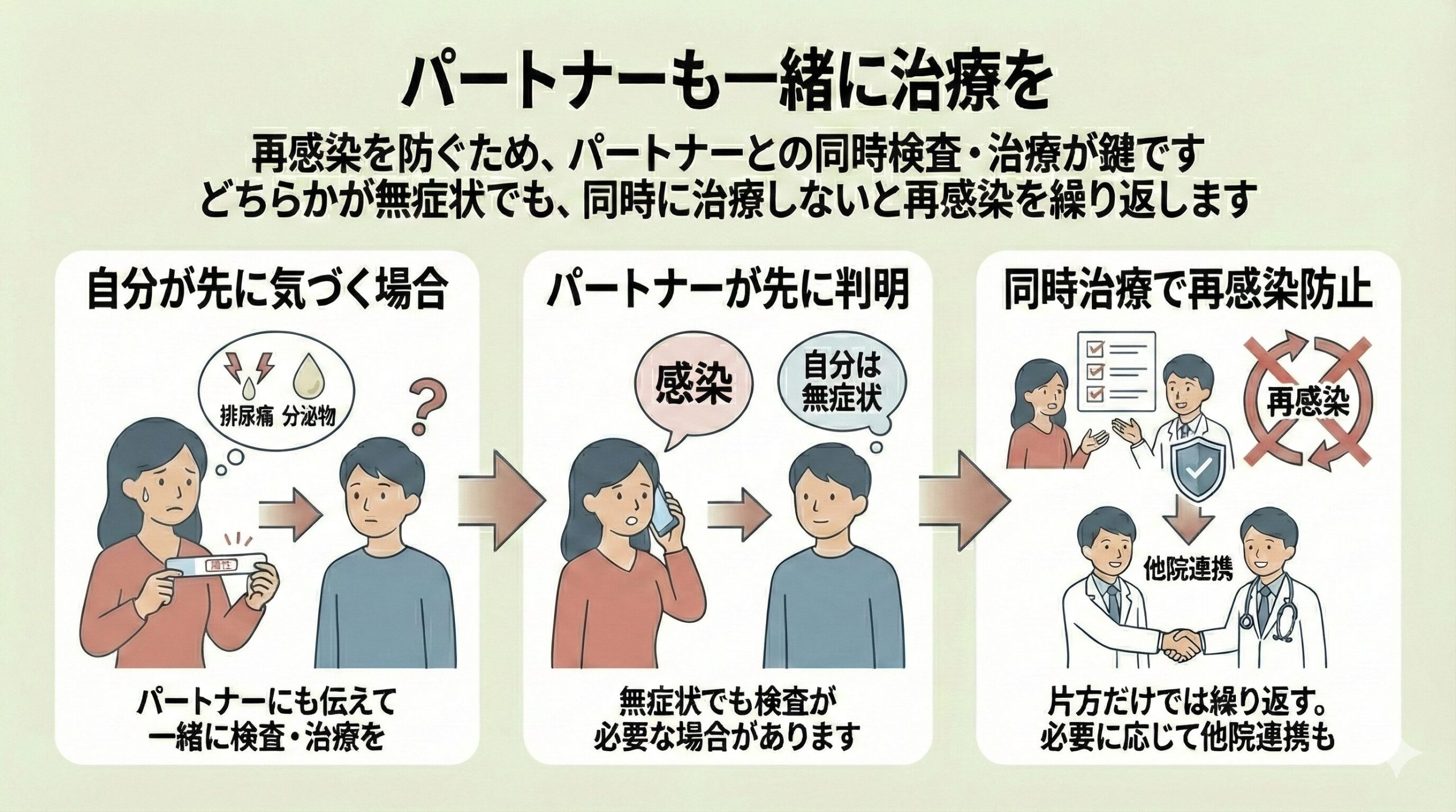 性感染症は、自分が最初に感染に気づく場合もあれば、パートナーの感染が先に判明して自分は無症状でも検査が必要になる場合もあります。どちらの場合でも、相手と一緒に検査・治療を進めることが再感染を防ぐ鍵です。