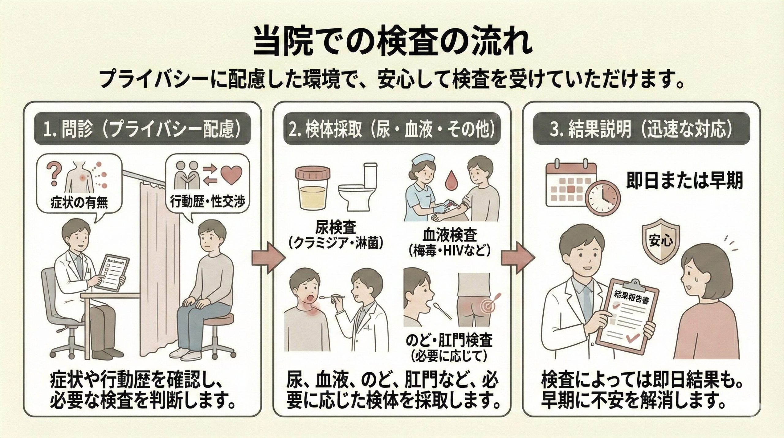 • のど・肛門の検査:オーラルセックスやアナルセックスによる感染もあるため、