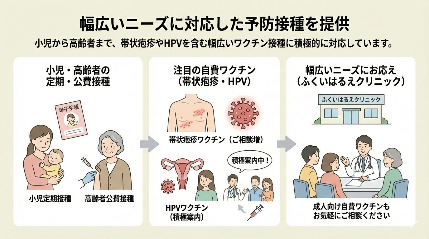 ふくいはるえクリニックでは、小児期の定期接種から高齢者向けの公費接種、そして成人を対象とした自費ワクチンまで、幅広いニーズに対応した予防接種を提供しています。