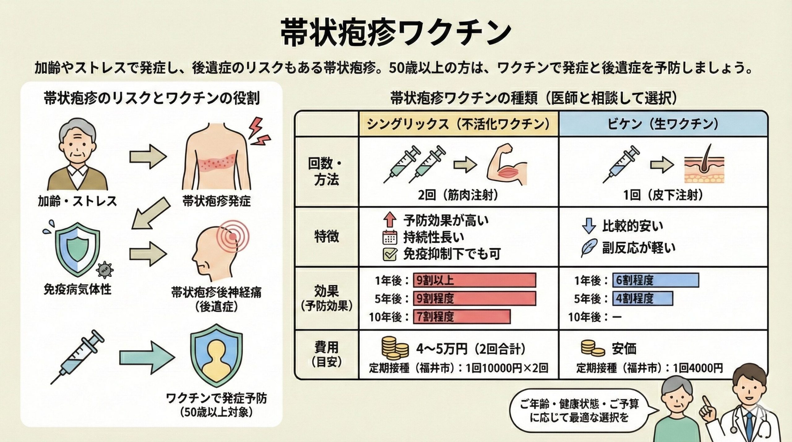 | シングリックス (不活化ワクチン) | 2回 (筋肉注射) | ・予防効果が高い ・持続性長い ・免疫抑制下でも可 | 接種後1年:9割以上の予防効果 接種後5年:9割程度の予防効果 接種後10年:7割程度の予防効果 | 定期接種の場合 福井市 1回10000円×2回4~5万円 (2回合計) |